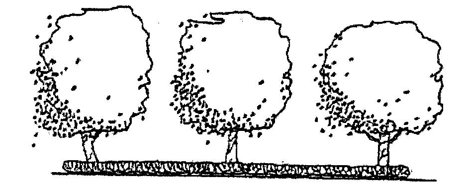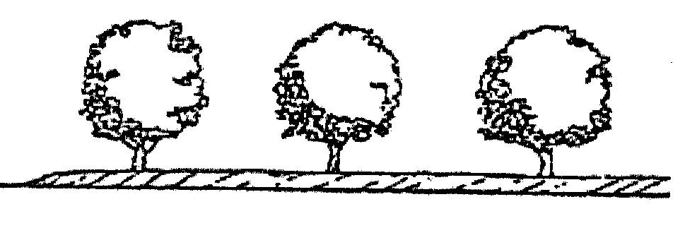 Semi-opaque screen, Type B: A screen that is opaque from the ground to a height of three (3) feet, with intermittent visual obstruction from above the opaque portion to a height of at least twenty (20) feet at maturity. This screen is intended to partially block visual contact between uses and to create a strong impression of the separation of spaces. The semi-opaque screen may be composed of a wall, fence, landscaped earth berm, planted vegetation, or existing vegetation. Planted trees shall be at least three (3) feet in height at planting. Suggested planting patterns which will achieve this standard are illustrated below: