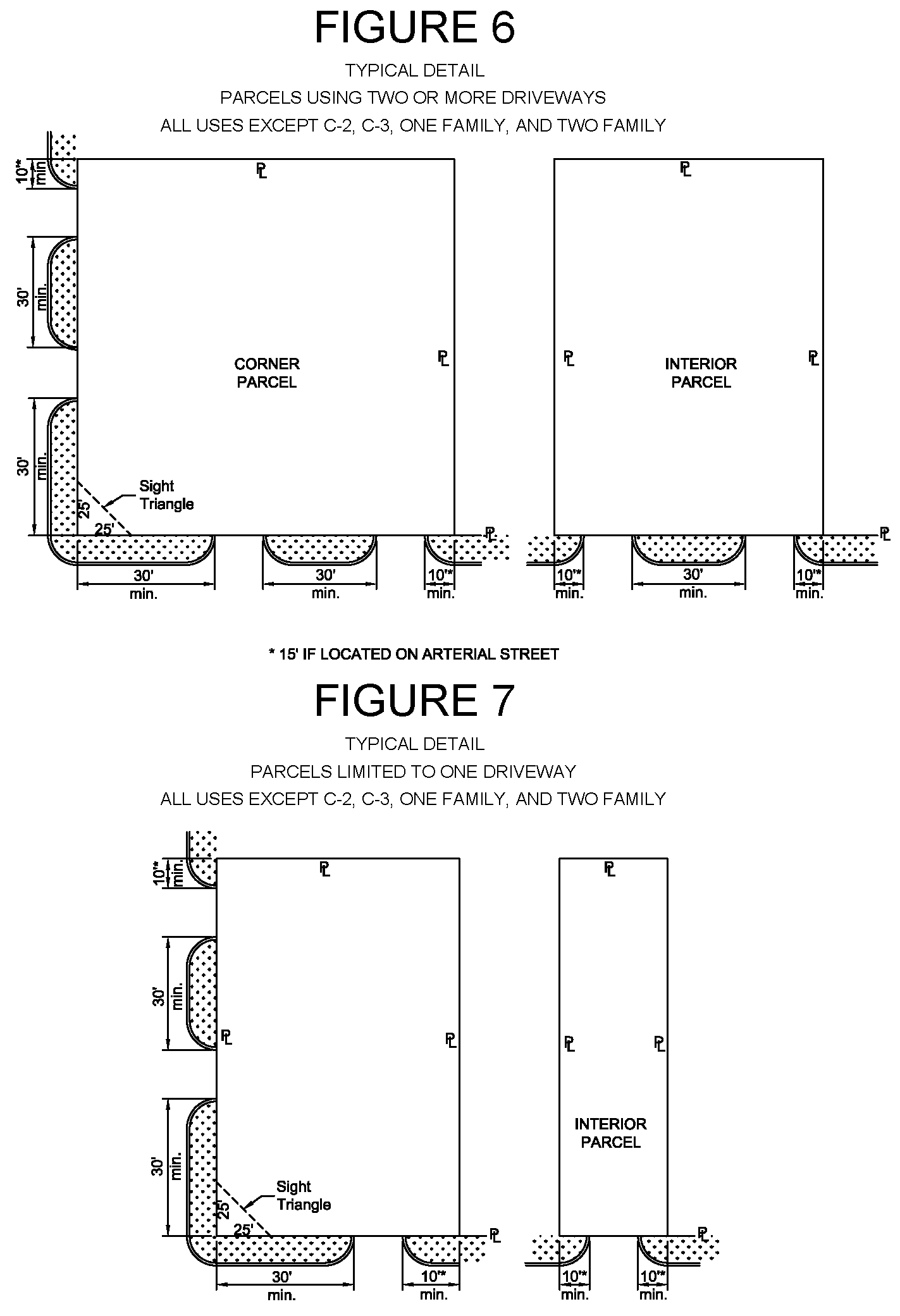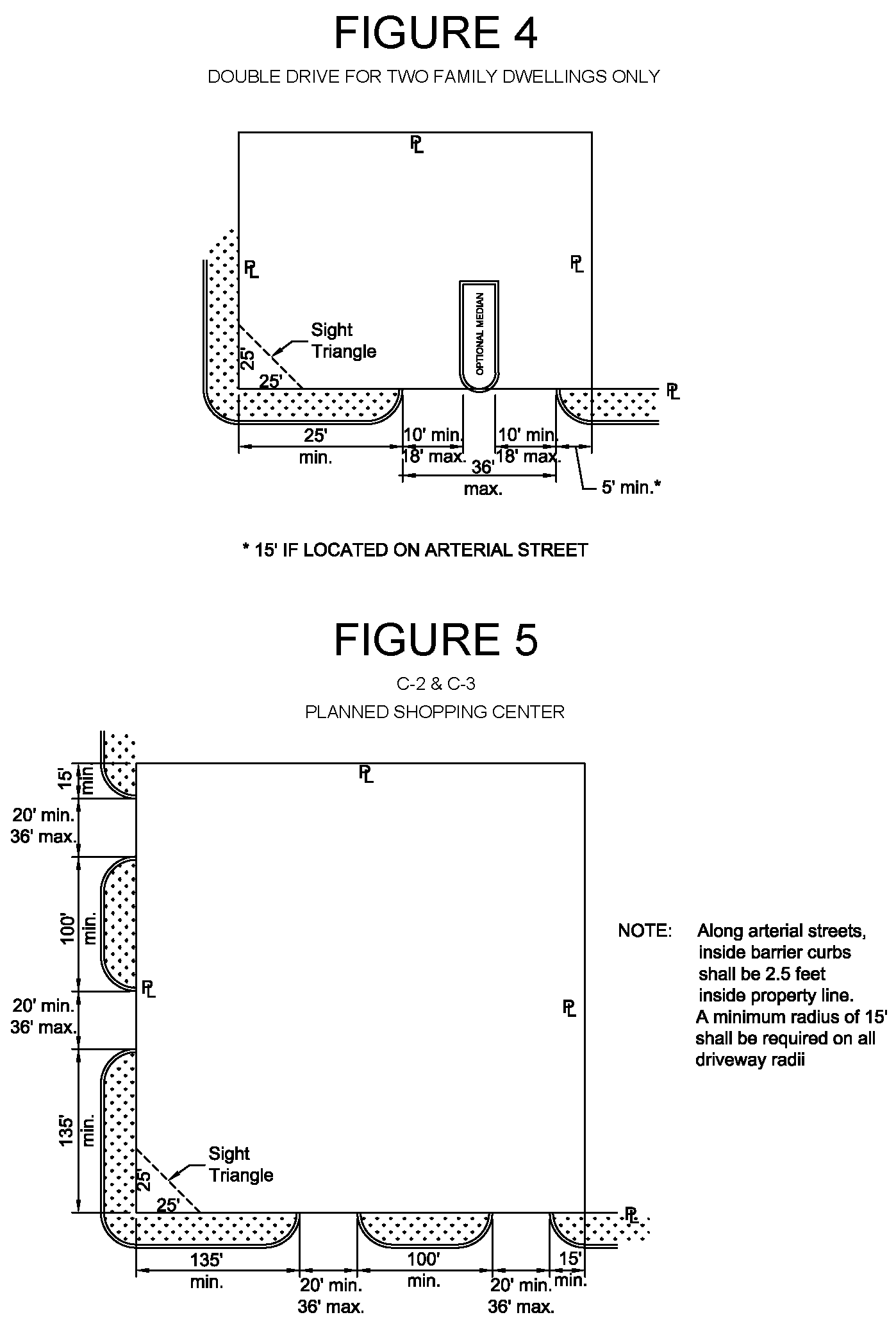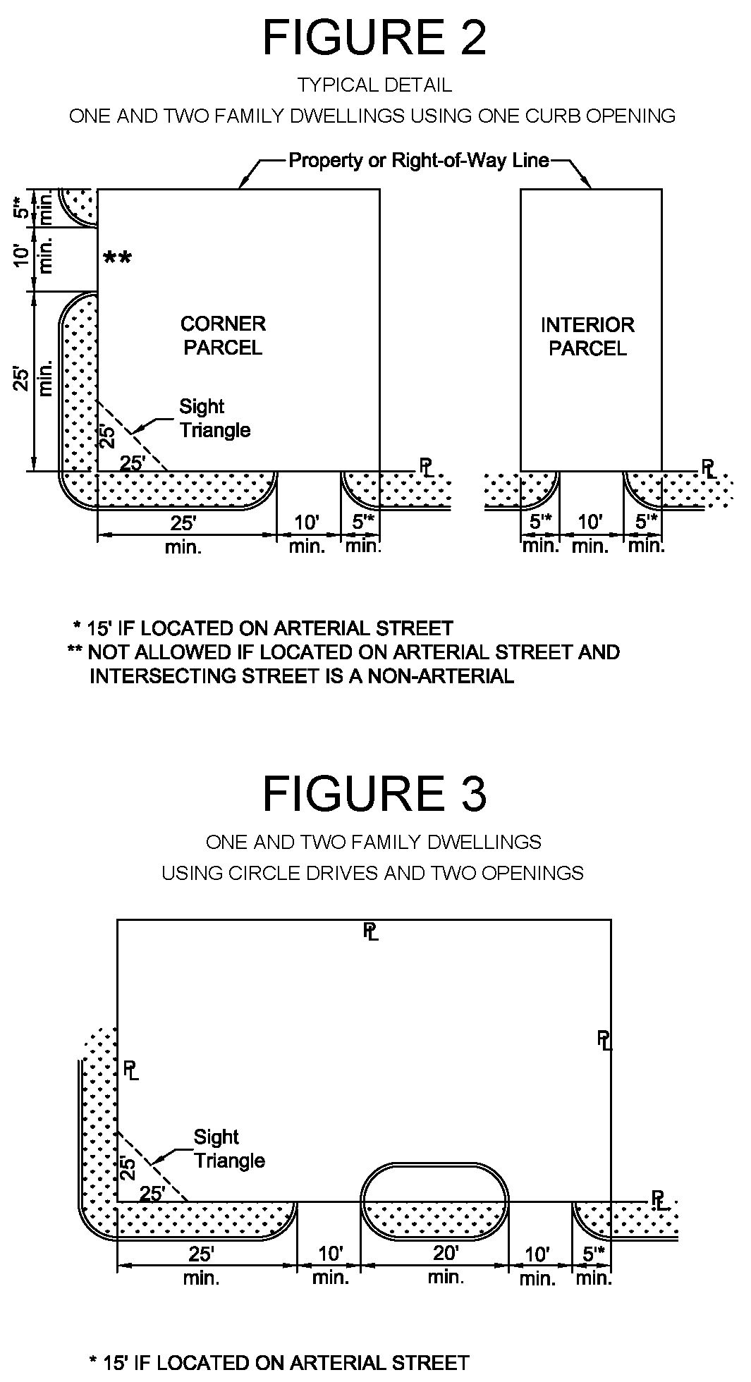 1 Minimums and maximums apply to each driveway measured at the property line with the exception of 1 & 2 family dwellings having frontage of 61′ to 300′. The maximum curb opening widths indicated shall be the maximum combined widths of each curb opening for these frontages.