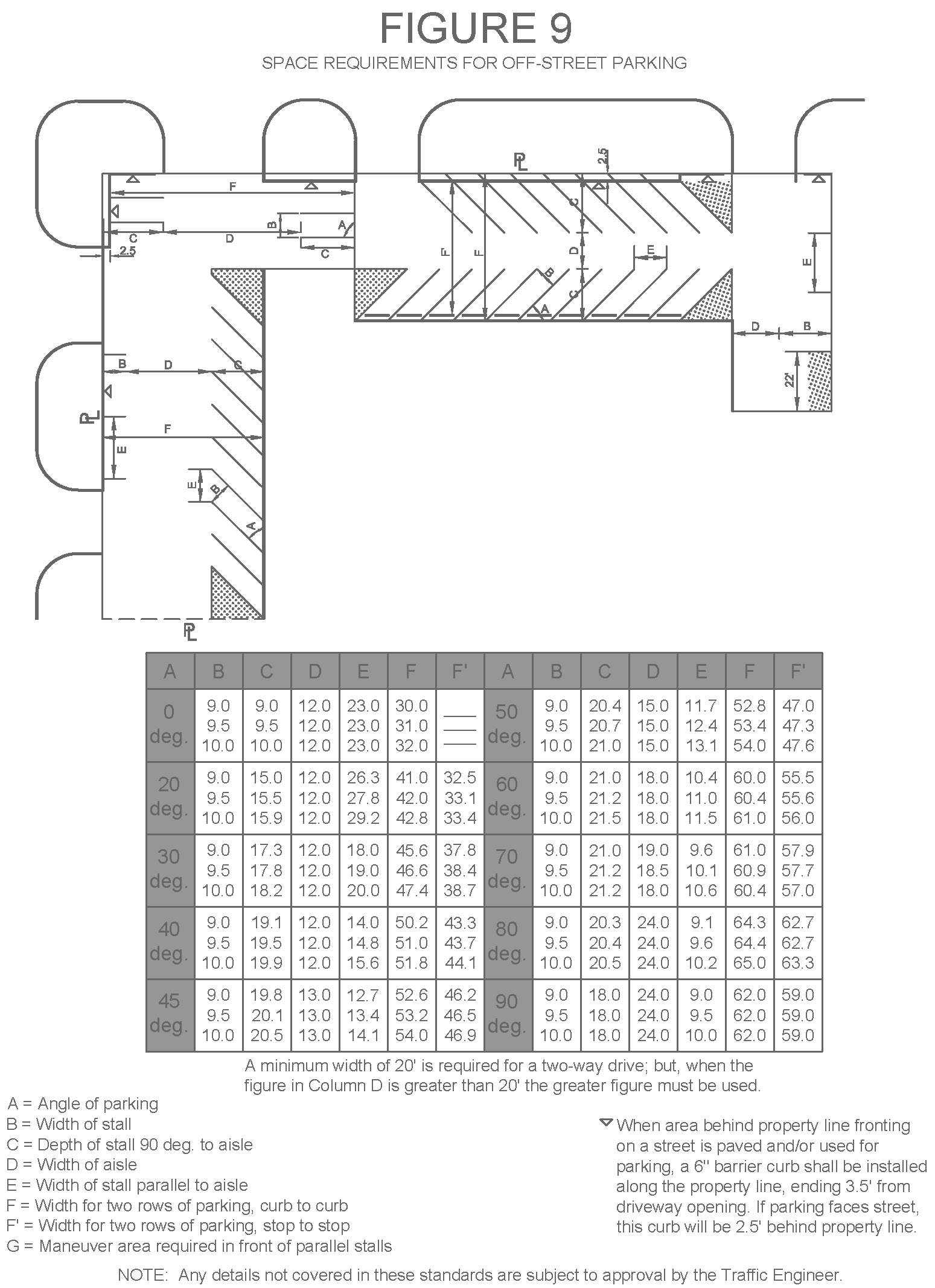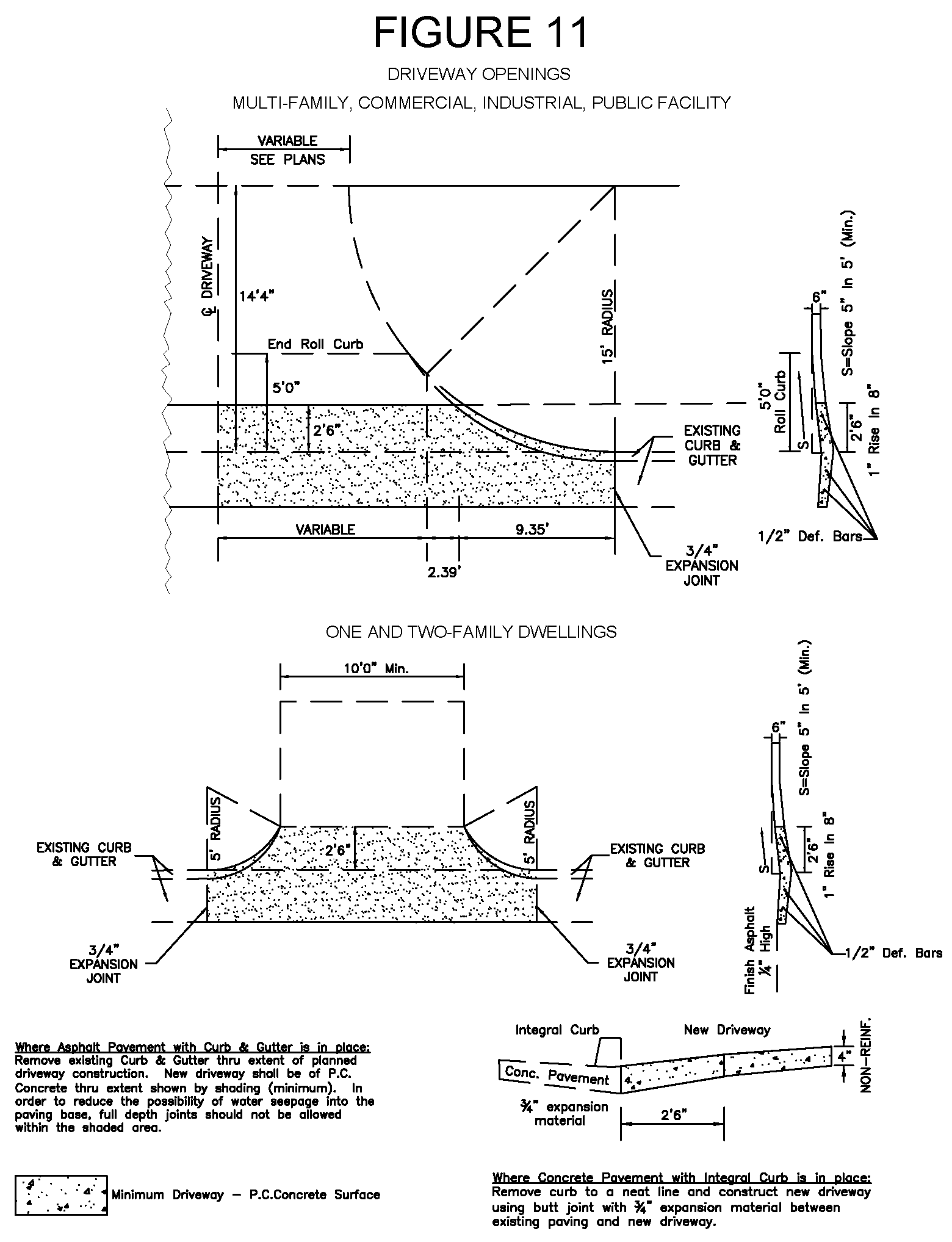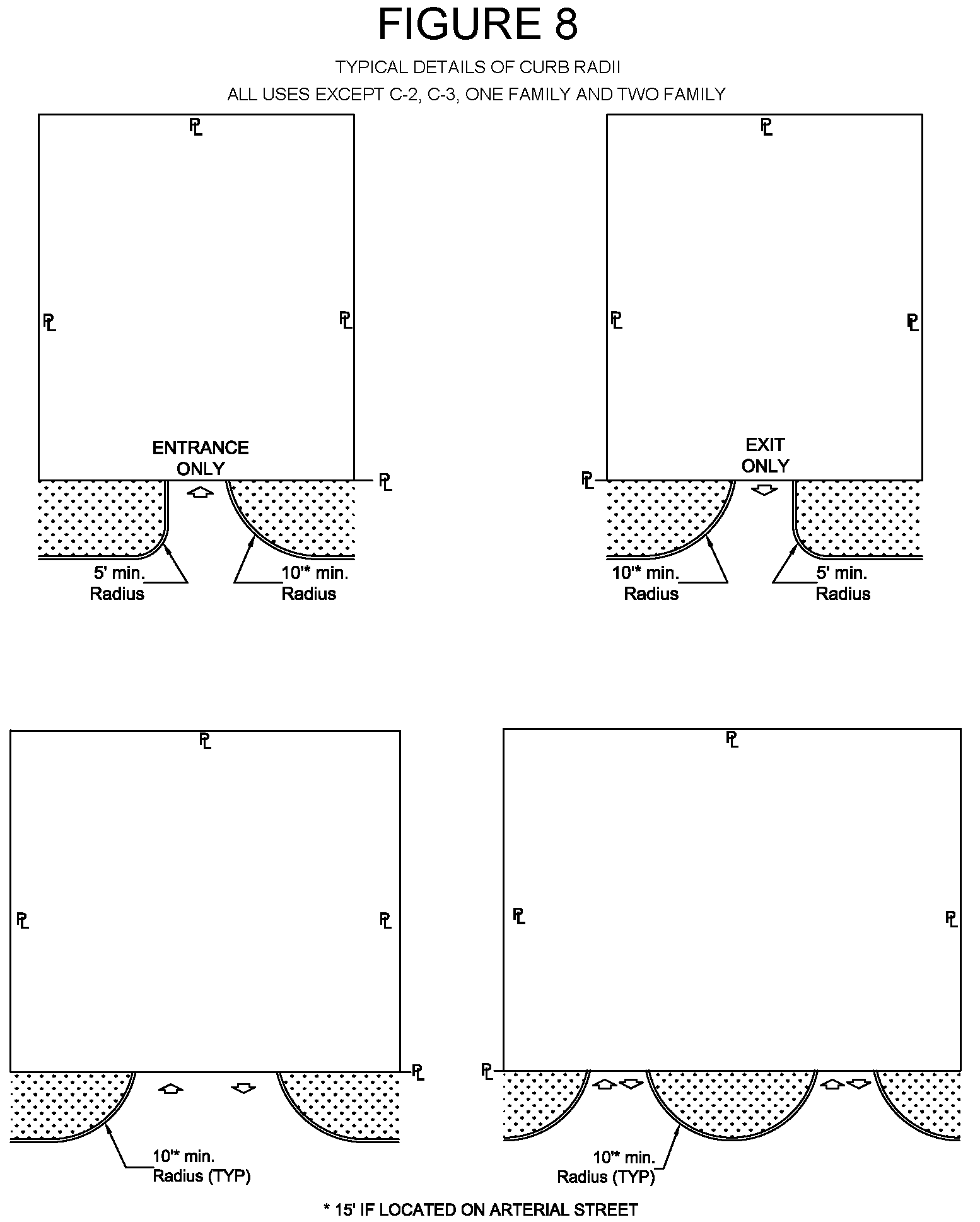 1 Minimums and maximums apply to each driveway measured at the property line with the exception of 1 & 2 family dwellings having frontage of 61′ to 300′. The maximum curb opening widths indicated shall be the maximum combined widths of each curb opening for these frontages.