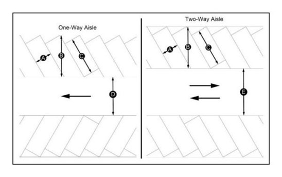 Angle or Style of Parking | Space Width (A) | Space Depth (B)1 | Space Length (C)2 | One-Way Aisle Width (D) | Two-Way Aisle Width (E) |