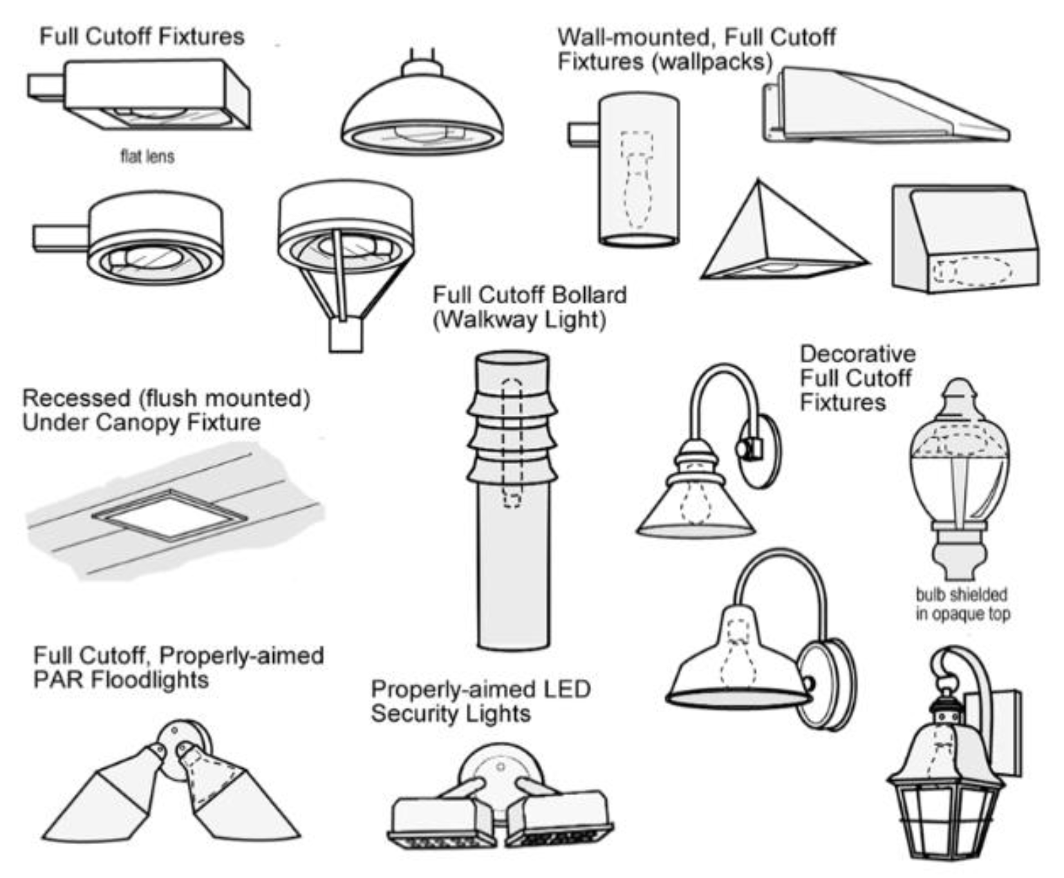 Cutoff light fixture required. Outdoor lights shall be full cutoff light fixtures so that their rays are directed toward the ground and away from adjacent residential property or streets and no light trespass falls on any residential property. A full cut-off light fixture has a solid barrier (cap) at the top of the fixture in which the lamp (bulb) is located. The fixture is angled so the lamp is not visible below the barrier (no light visible below the horizontal angle).