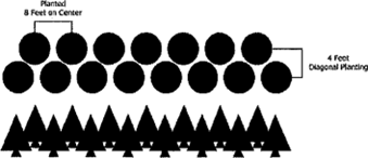 [Transitional buffer yards.] A transitional buffer yard (TBY) shall be used to screen solar electricity farms from adjacent properties and adjacent public rights-of-way. The TBY shall be located within the required 75-foot setback area. The TBY must achieve a 100 percent screen through the use of either landscape berms or trees to a minimum height of eight feet within two years of installation. To achieve this appearance with trees, a staggered spacing approach with trees on eight-foot centers, should be utilized as shown below. All TBY landscaping shall be evergreen trees. Trees and/or landscape berms may be placed on either the inside or outside of any required fencing. The TBY must be kept in excellent condition, with dead or diseased trees removed and replaced on an annual basis, or as otherwise required in writing by the mayor or the mayor's designee.