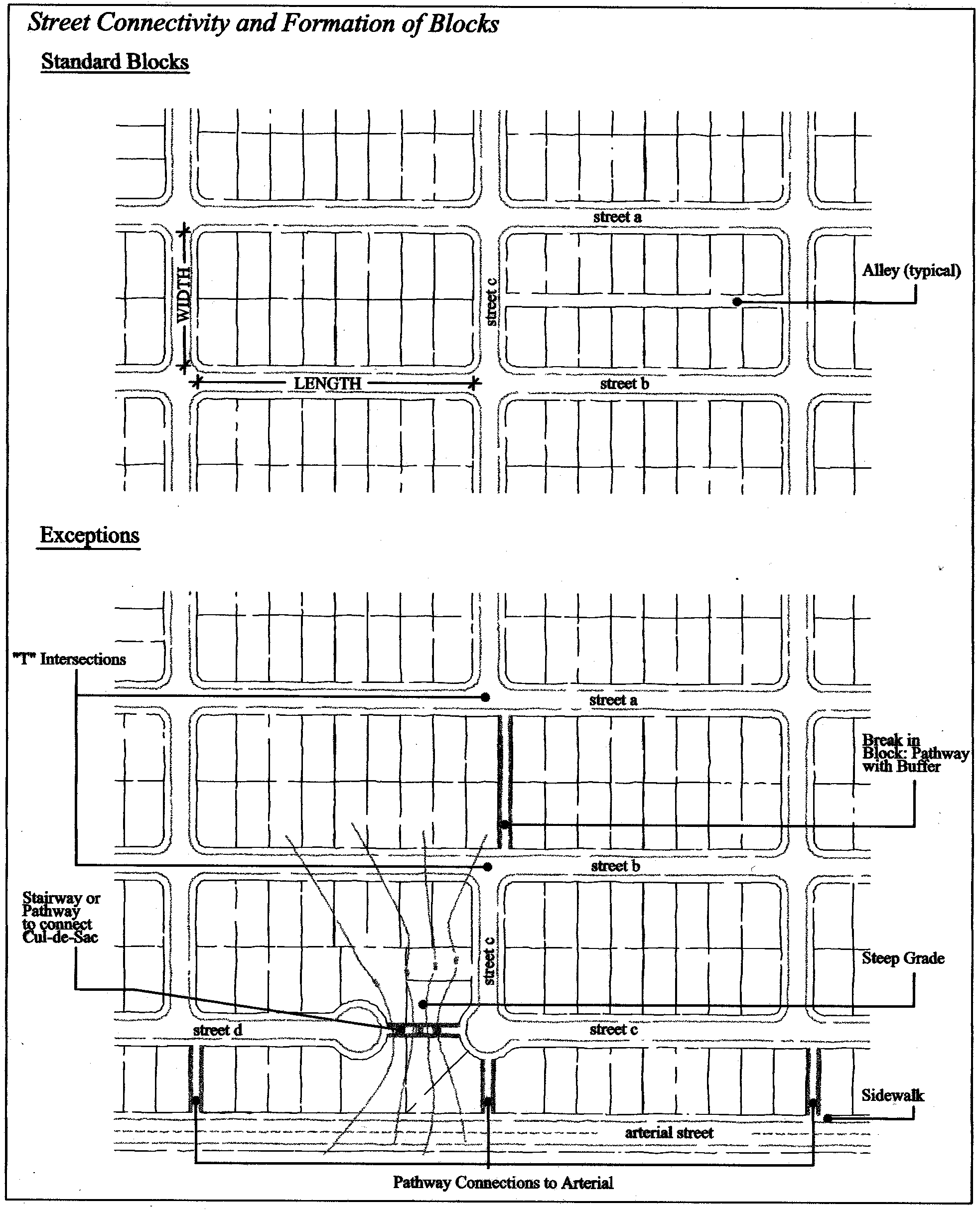 Section 16.12.060 lists exceptions to the placement standards for streets and pathways for pedestrians and bicyclists.