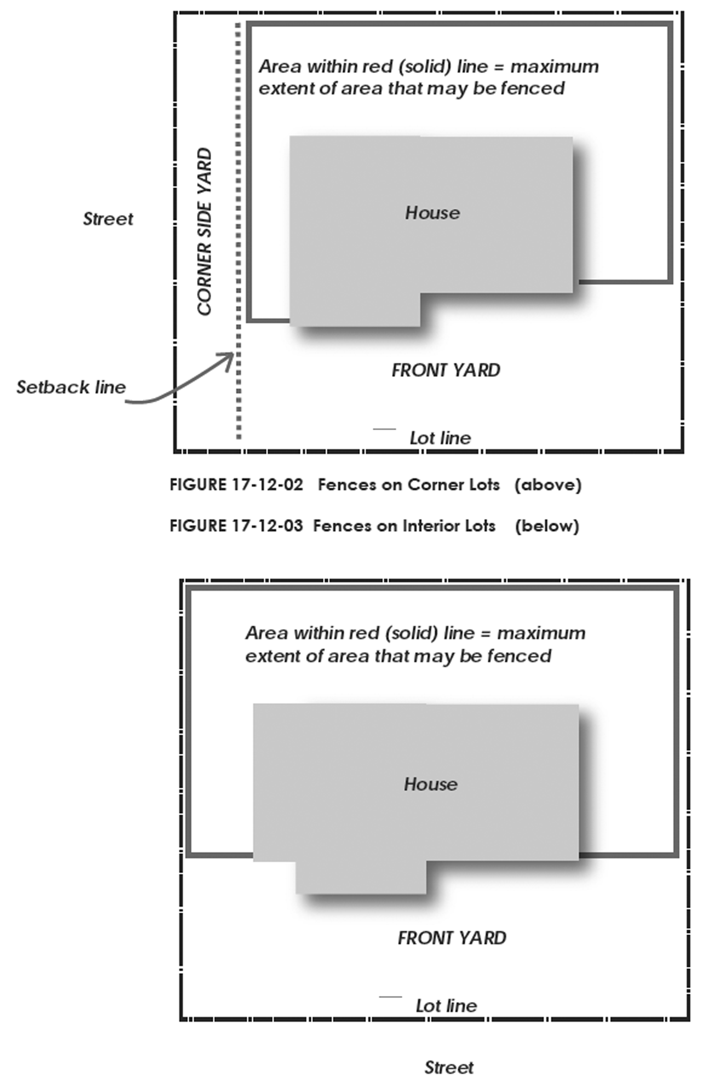 Permitted Locations. In an R district, fences are permitted only in conformance with Figures 17-12-02 and 17-12-03 of this chapter and in any portion of a front yard as specified in paragraph B of this section.