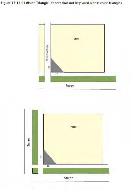 Visibility. Fences shall not obscure the visibility of motorists. Figure 17-12-01 illustrates the prohibited area for all fences.