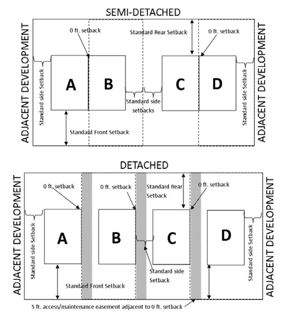 Where detached development is proposed, each lot should have a 5 feet maintenance/access easement adjacent to the zero-lot-line setback on the adjoining lot (see Figure 819A, below).