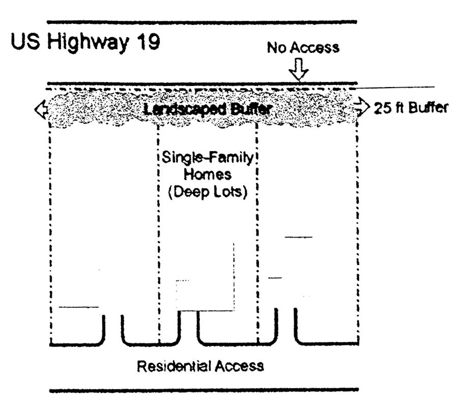 When a residential subdivision is proposed, it shall be designed to provide access to individual lots that abut U.S. Highway 19 from a frontage road or interior local road (see Figure 2). A berm or buffer may be required at the rear of residential lots to buffer residences from traffic on U.S. 19. The berm or buffer shall not be located within the public right-of-way.