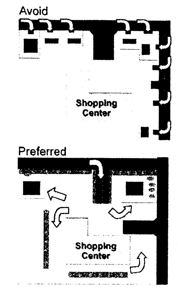Access to outparcels shall be internalized using the shared circulation system and designed to avoid excessive movement across parking aisles or queuing across surrounding parking and driving aisles (see Figure 3).