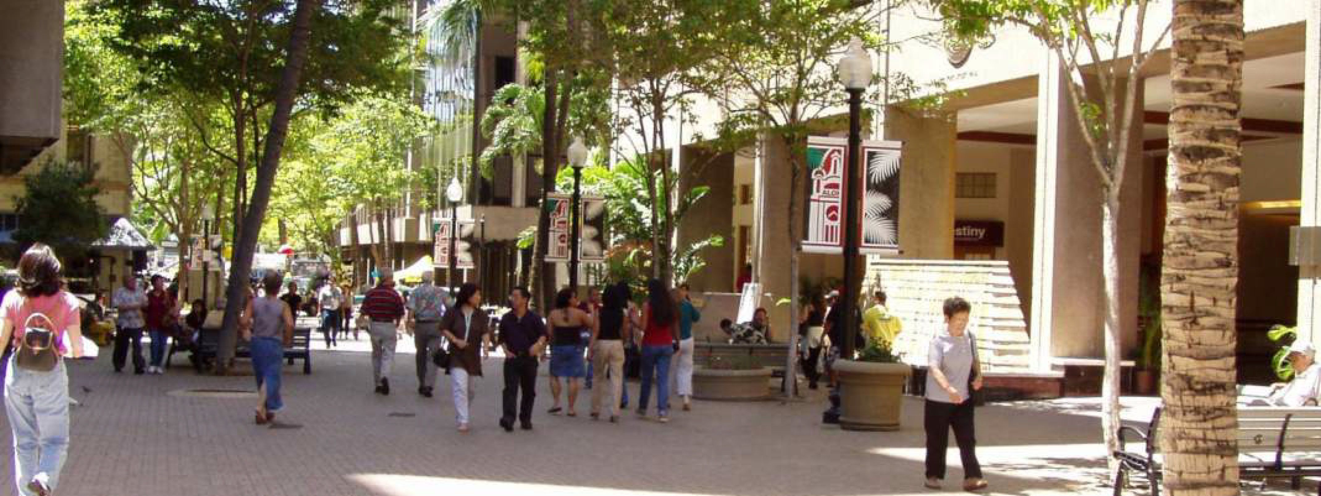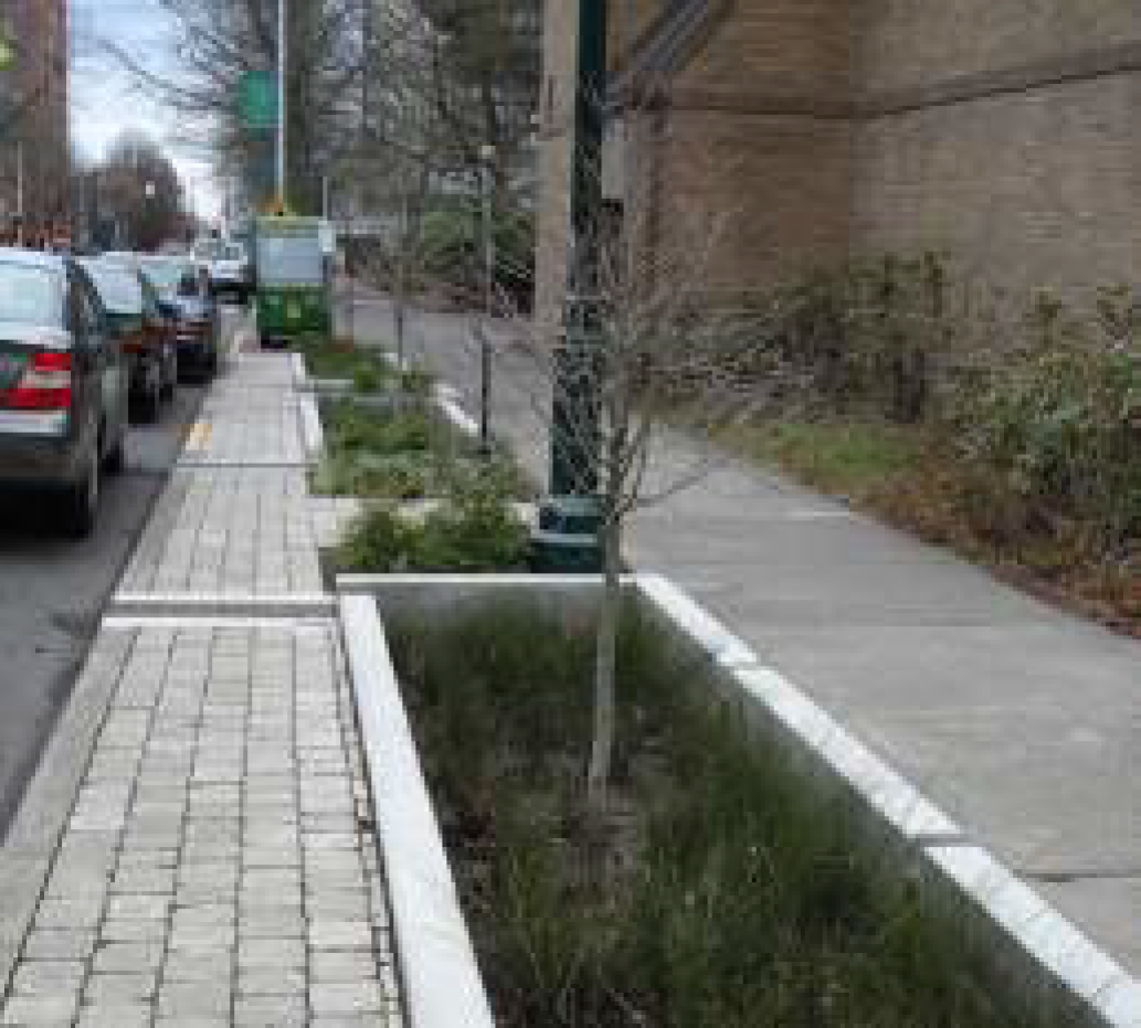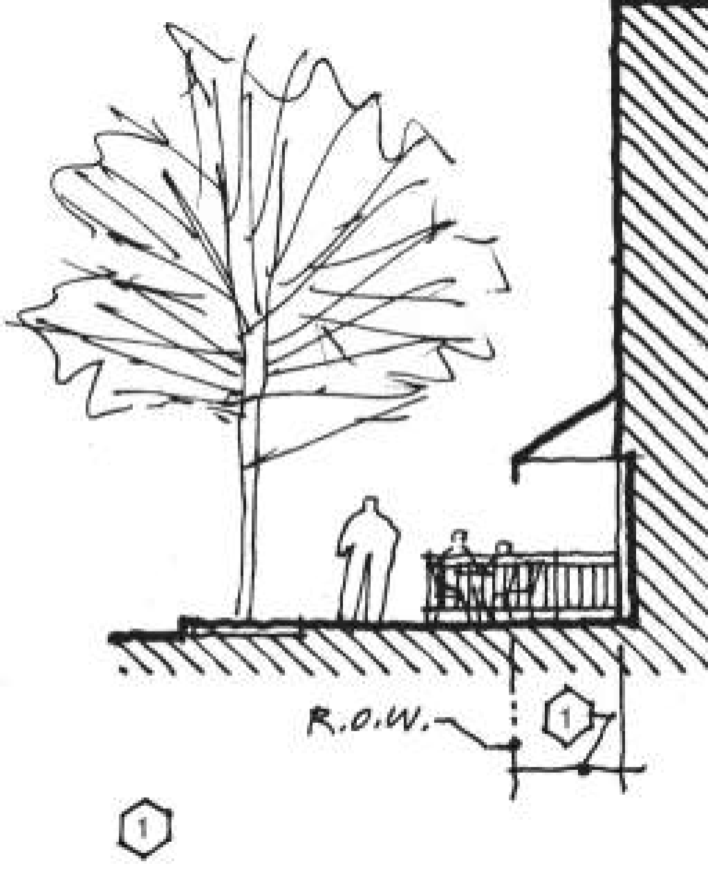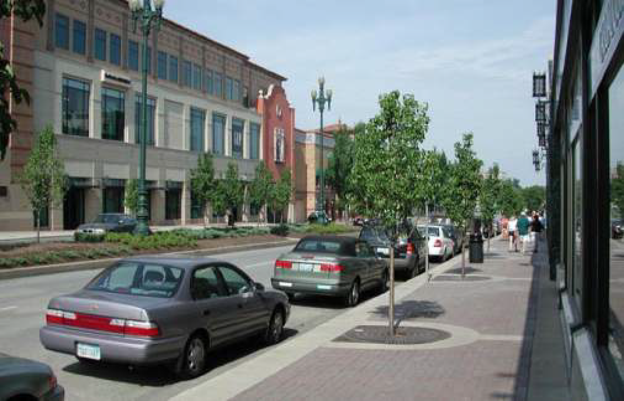To provide amenities for pedestrians, sidewalks should incorporate street trees, benches, kiosks and plazas.