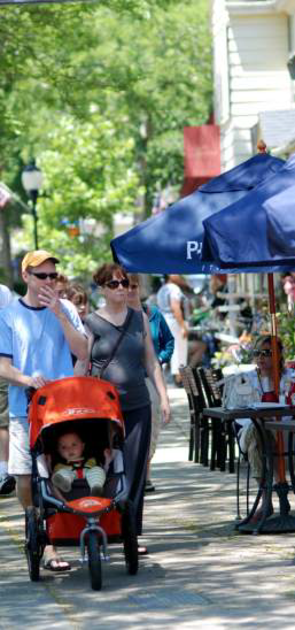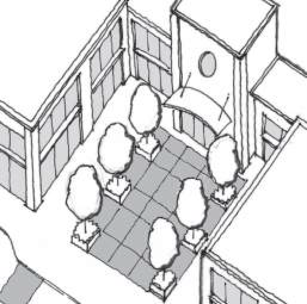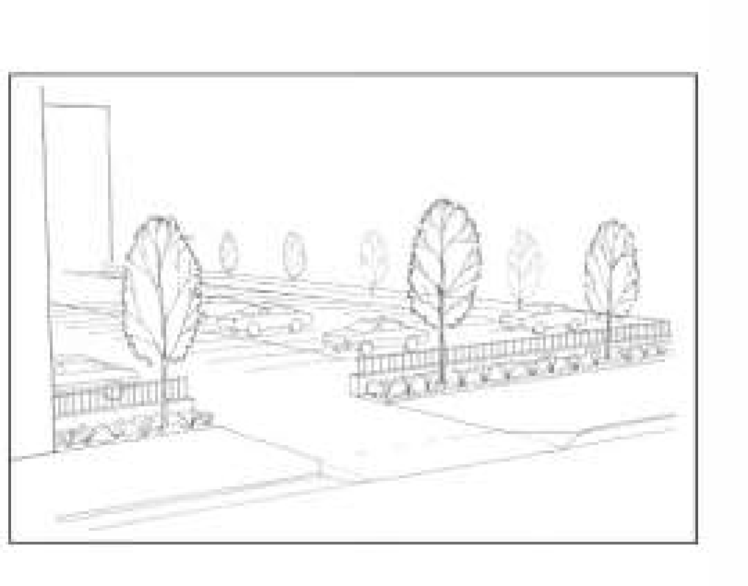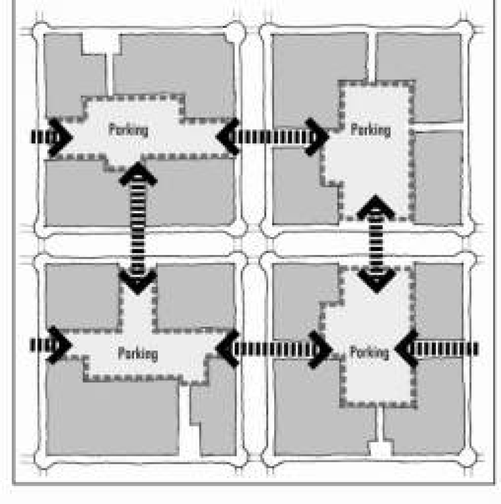 To promote a pedestrian-oriented environment, pedestrian routes should be buffered from fast-moving traffic and expanses of parking.
