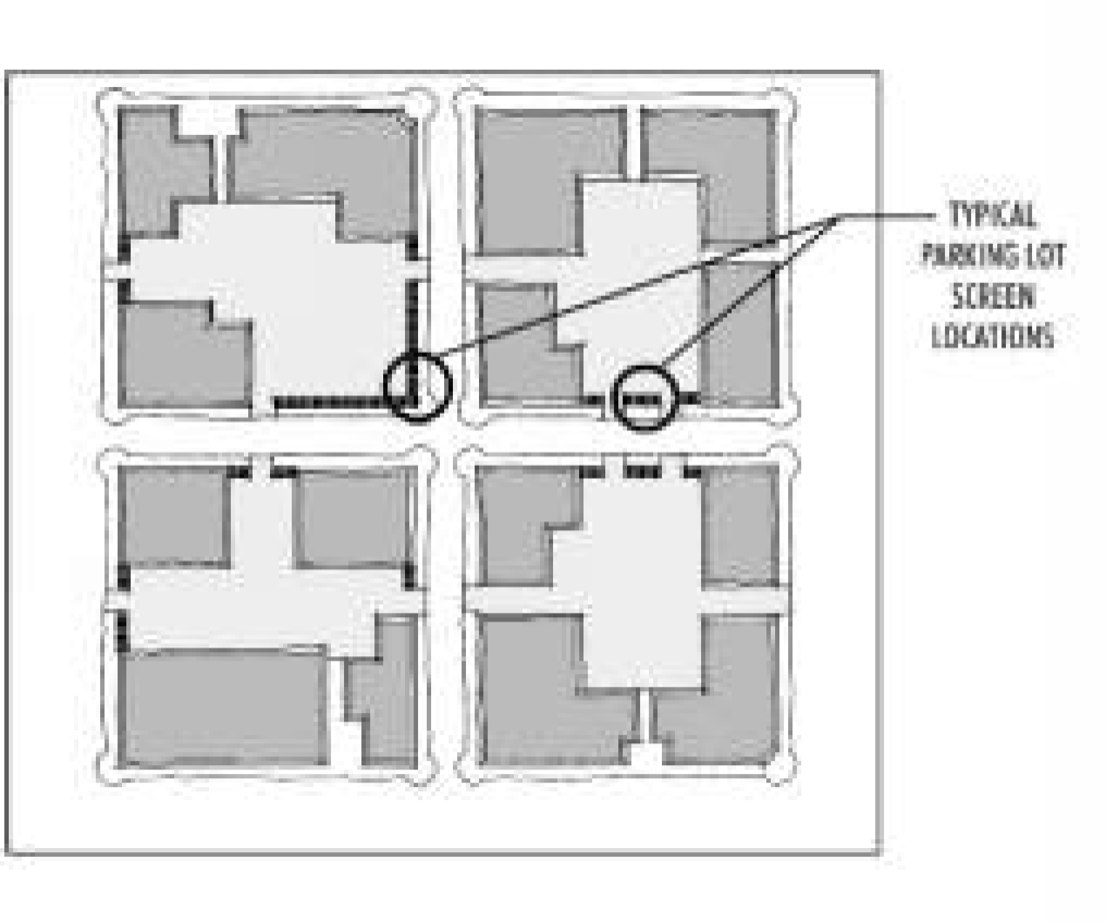 To improve development character, parking locations should be less prominent and located to the rear of buildings or in parking structures.