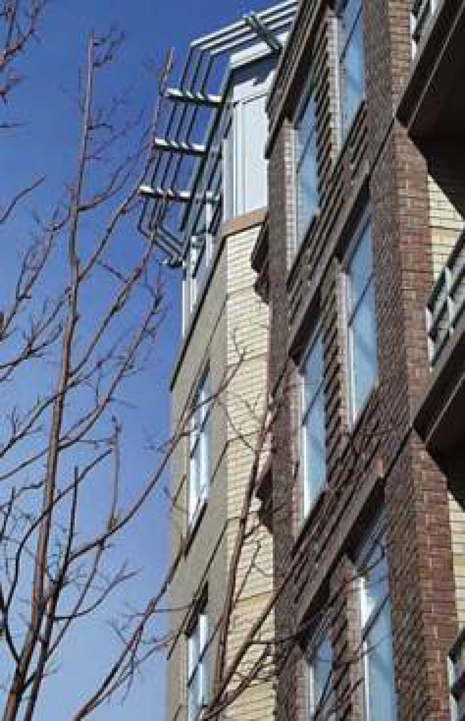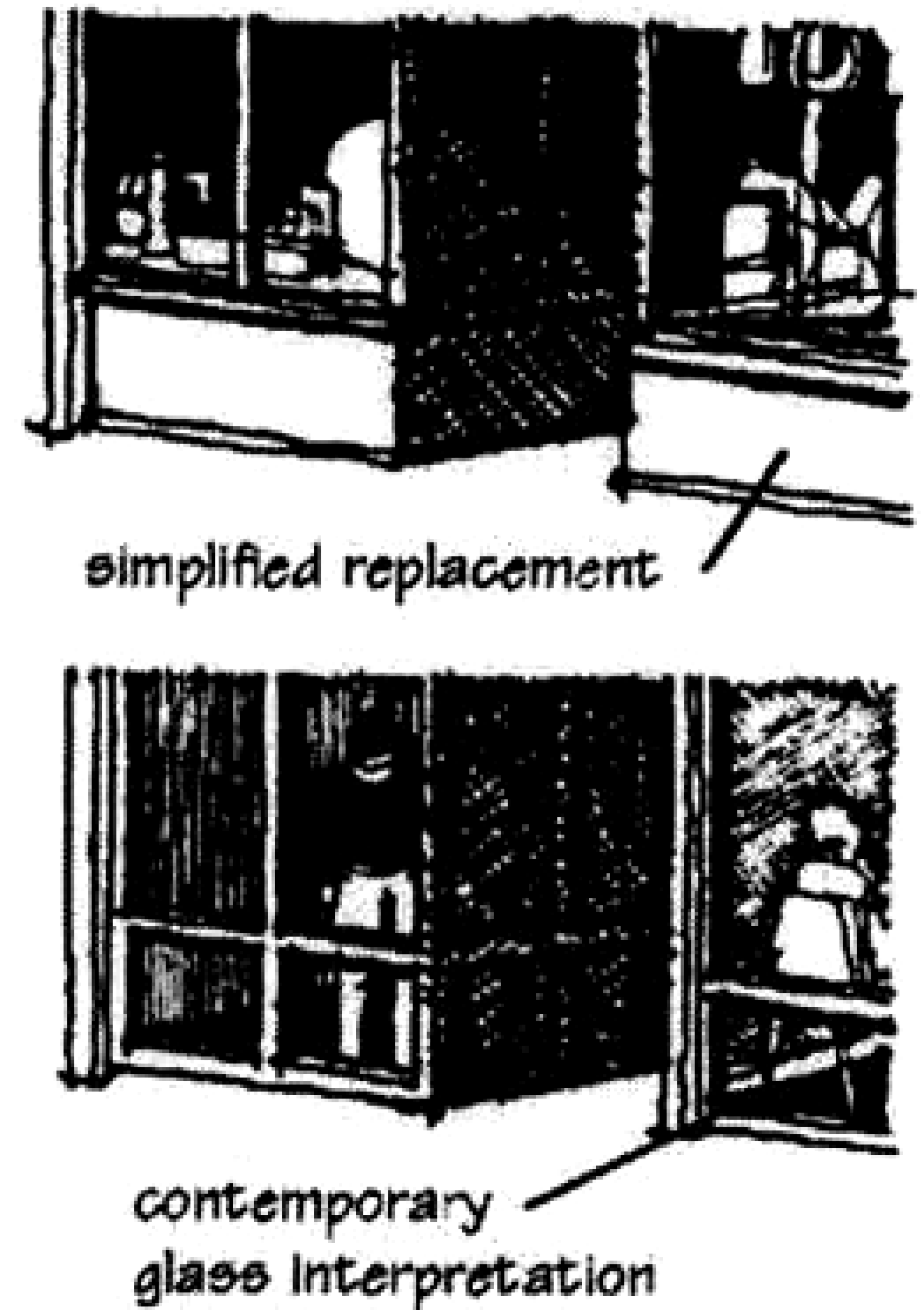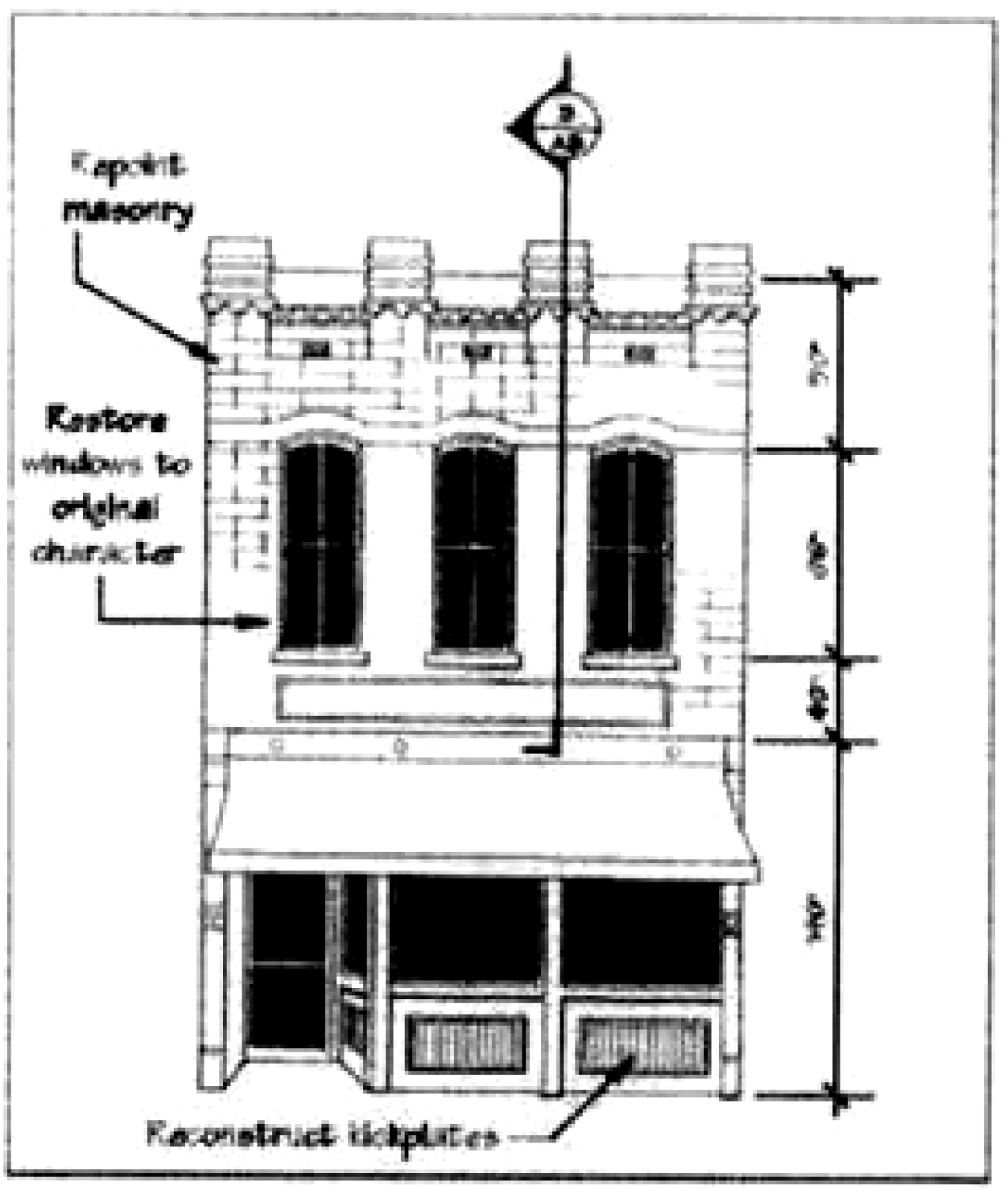 Tall, narrow, double-hung windows, often with arched or round arch heads (commonly referred to as "punched" windows as opposed to "ribbon" windows)