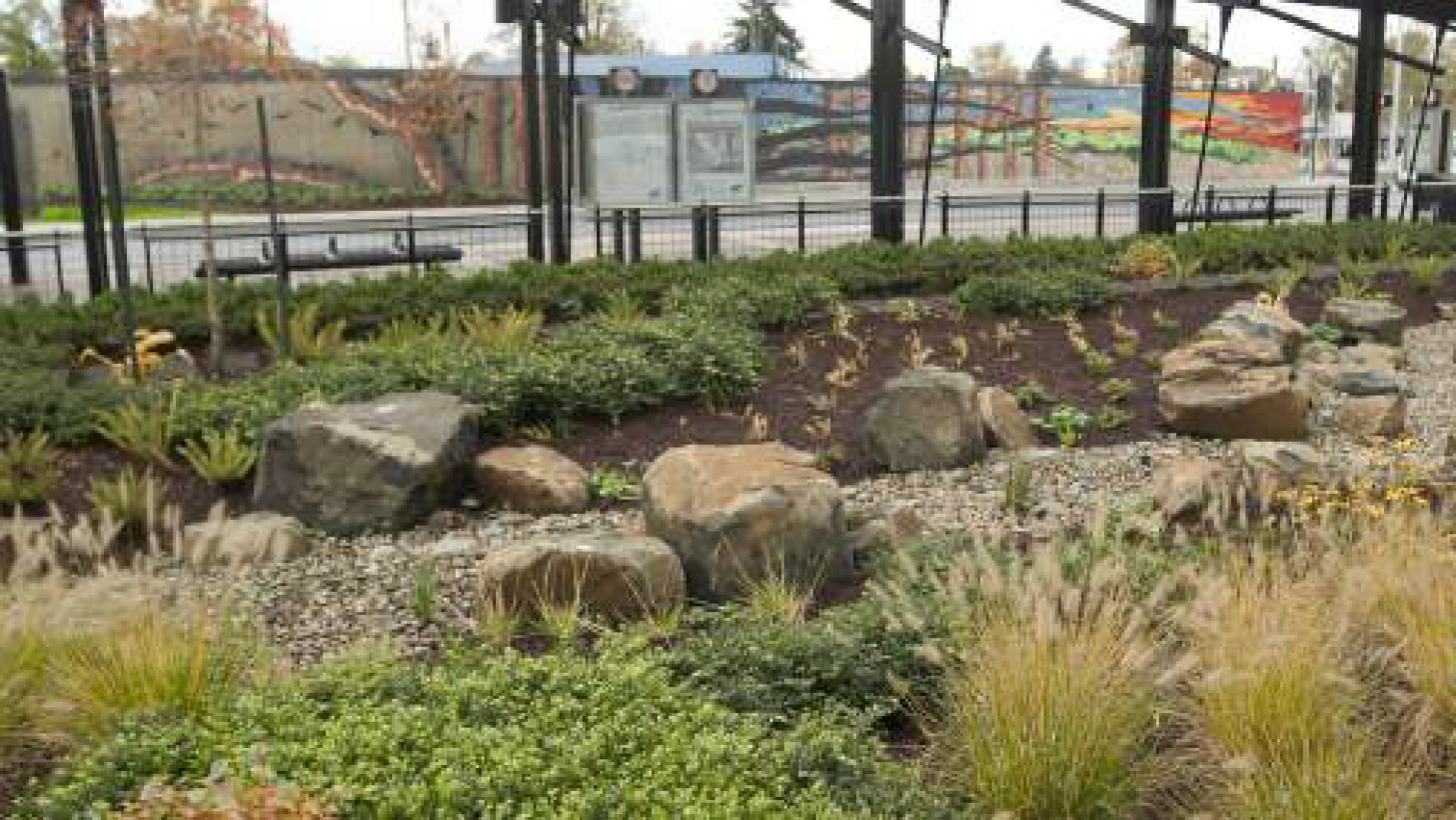 To improve the aesthetic quality, fencing treatments should incorporate live, drought-tolerant vegetation, where direct transparency for safety is not required.