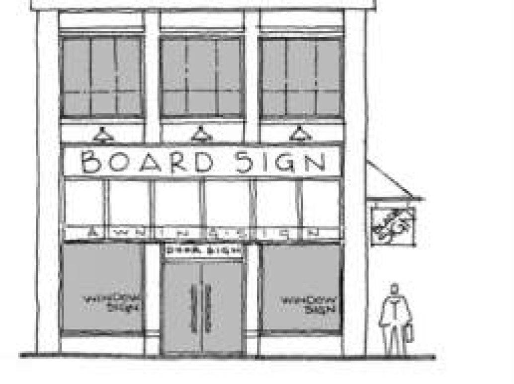 Secondary signs are utilized in addition to the primary building sign and generally tied to an architectural feature. Typically, a secondary sign is an awning, projecting sign or window sign. The secondary sign is generally intended to capture the attention of a pedestrian walking on the sidewalk, while the primary sign's audience is typically driving past in a vehicle.