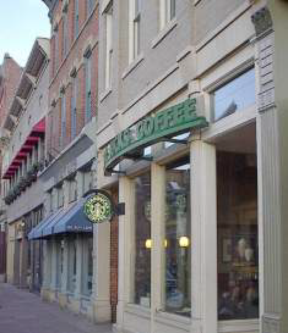 Sign Hierarchy - Signs should work together in a hierarchical relationship. The larger, primary signs of a business such as a monument sign or a wall sign would most likely express the main idea of the business, including the name and perhaps an iconic graphic representing the industry or character of the place. Secondary signs, such as window and hanging signs, strengthen the overall theme offering supporting information. For example, a cafe may contain the name of the business on the wall sign and then in smaller lettering on the window, list items offered (e.g., coffee, tea, pastries, etc.). In this way, the information is organized in the same format it is processed by the viewer: first locating the destination, then selecting options at that location. Duplicating information on the same facade does not utilize the allowable sign area to its full potential and is discouraged in Old Town.