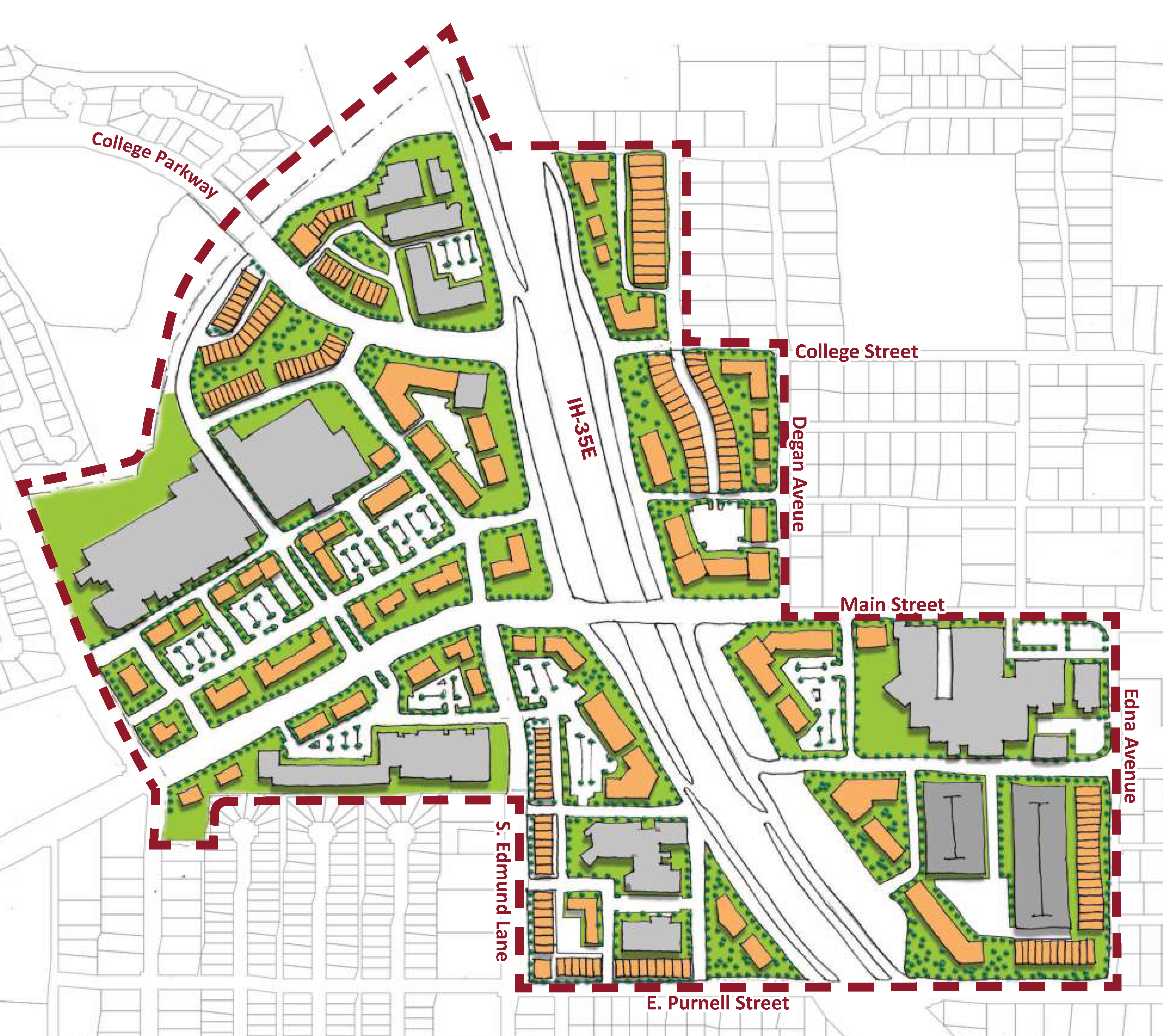 The IH-35E Corridor Overlay District is defined as all land located within the area bounded by the following: Beginning at the southwest corner of the intersection of North Stemmons Freeway (IH-35E) and North Garden Ridge Boulevard, running westerly along the south right-of-way line of North Garden Ridge Boulevard to the northwest corner of a 3.221-acre tract of land out of the F. Pierce Survey, Abstract No. 1016 conveyed to IH-35 & Garden Ridge Acquisitions, LP, then southerly and easterly along the western and southern boundaries of said IH-35 & Garden Ridge Acquisitions, LP tract to the west right-of-way line of North Stemmons Freeway, (IH-35E), then southerly along the west right-of-way line of North Stemmons Freeway (IH-35E) and crossing Bogard Lane to the southeast corner of the intersection of Bogard Lane and McGee Lane, then southerly along the east right-of-way line of McGee Lane to the northeast corner of the intersection of McGee Lane and the KCS Railroad, then easterly along the north right-of-way line of the KCS Railroad to the northeast corner of the intersection of the KCS Railroad and North Summit Avenue, then southerly along the east right-of-way line of North Summit Avenue to the northwest corner of Lot 1, Block H, Valley Ridge Residential Addition, then easterly along the north boundaries of Lot 1, Block H, Valley Ridge Residential Addition and Lot 3, Block I, Valley Ridge Business Park West Phase 9 to the west right-of-way line of North Stemmons Freeway (IH-35E), then southerly along the east boundary and westerly along the south boundary of Lot 3, Block I, Valley Ridge Business Park West Phase 9, then westerly along the south boundary of Lot 1, Block H, Valley Ridge Residential Addition to the north right-of-way line of College Parkway, then crossing the right-of-way College Parkway in a southwesterly direction to the eastern corner of Lot 1, Block A, Parkway Estates Addition, then in a southwesterly direction along the eastern and southern boundaries of Lot 1, Block A, Parkway Estates Addition to the southeast corner of a drainage right-of-way dedicated on the final plat of Fireside Village Addition, then westward along the southern boundary of said drainage right-of-way to the eastern right-of-way line of North Summit Avenue, then southward along the east right-of-way line of North Summit Avenue crossing West Main Street and continuing southerly along the east right-of-way line of Surf Street to the southwest corner of Lot 3, Block B, Harbor Heights, then eastward along the south boundary of Lot 3, Block B, Harbor Heights to the southeast corner of said lot, then northward along the east boundary of Lots 3, 2, and 1 A, Block B, Harbor Heights to the southwest corner of Lot 6 (PT), Valley Square, then easterly along the south boundary of Lots 6 (PT), 3 and 2, Valley Square to a point being the intersection of the south boundary of Lot 2, Valley Square and the northward extension of the western boundary of Lot 5, Block G, Quailcrest, then south across the public alley to the northwest corner of Lot 5, Block G, Quailcrest and continuing southerly along the west boundaries of Lots 5, 4B, 3, 2 and 1, Block G, Quailcrest to the north right-of-way line of West Purnell Street, then east along the north right-of-way line of West Purnell Street to the west right-of-way line of South Stemmons Freeway (IH-35E), then southeasterly along the west right-of-way line of South Stemmons Freeway (IH-35E) to the northwest corner of a 0.9759-acre tract of land out of the J. Sutton Survey, Abstract No. 1155 conveyed to Neville Texas Investments, LLC, then south along the west boundary of said Neville Texas Investments LLC tract and continuing south along the west boundary of a 4.0839-acre tract and an 8.141-acre tract, both out of the J. Sutton Survey, Abstract No. 1155 conveyed to AVB Ltd, to the north right-of-way line of Fox Avenue, then in a southeasterly direction across the Fox Avenue right-of-way to the northwest corner of Lot 1, Block A, Fox Haven Addition, then south and easterly along the west boundary and south boundary of Lot 1, Block A, Fox Haven Addition to the west boundary of Lot 6R, Block A, Fox-IH35E Addition, then southeasterly, east, and northeasterly along the west, south and southeast boundaries of Lot 6R, Block A, Fox-IH35E Addition to the west right-of-way line of South Stemmons Freeway (IH-35E), then southeasterly along the west right-of-way line of South Stemmons Freeway (IH-35E) to the north-most corner of Lot 3 (PT), Block A, Lakeland Plaza Addition, then southwesterly and southerly along the northwest and west boundaries of Lots 3 (PT) and 1 (PT), Block A, Lakeland Plaza Addition to the northwest corner of Lot 1, Block A, Peppermint Addition, then south along the west boundary of Lot 1, Block A, Peppermint Addition to the north right-of-way line of Oakwood Lane, then easterly, southerly and easterly along the north, east and north right-of-way lines (following curves) of Oakwood Lane to the east right-of-way line of SH 121 Business, then south along the east right-of-way line of SH 121 Business to the southwest corner of Lot 1, Block A, Rider Addition, then east along the south boundaries of Lot 1, Block A, Rider Addition and Lot 1R, Block A, Bankston Nissan Addition to the west boundary of Lot 1, Block A, Lewisville Mitsubishi Addition, then south along the west boundaries of Lot 1, Block A, Lewisville Mitsubishi Addition and Lot 1, Block A, Toyota of Lewisville to the southwest corner of Lot 1, Block A, Toyota of Lewisville, then east along the south boundary of Lot 1, Block A, Toyota of Lewisville to the northwest corner of Lot 1 A, Block C, Timber Creek Square Phase I, then south along the west boundary of Lot 1 A, Block C, Timber Creek Square Phase I to the northeast right-of-way line of East Southwest Parkway, then southeasterly along the northeast right-of-way line of East Southwest Parkway to the south right-of-way line of East Corporate Drive, then s