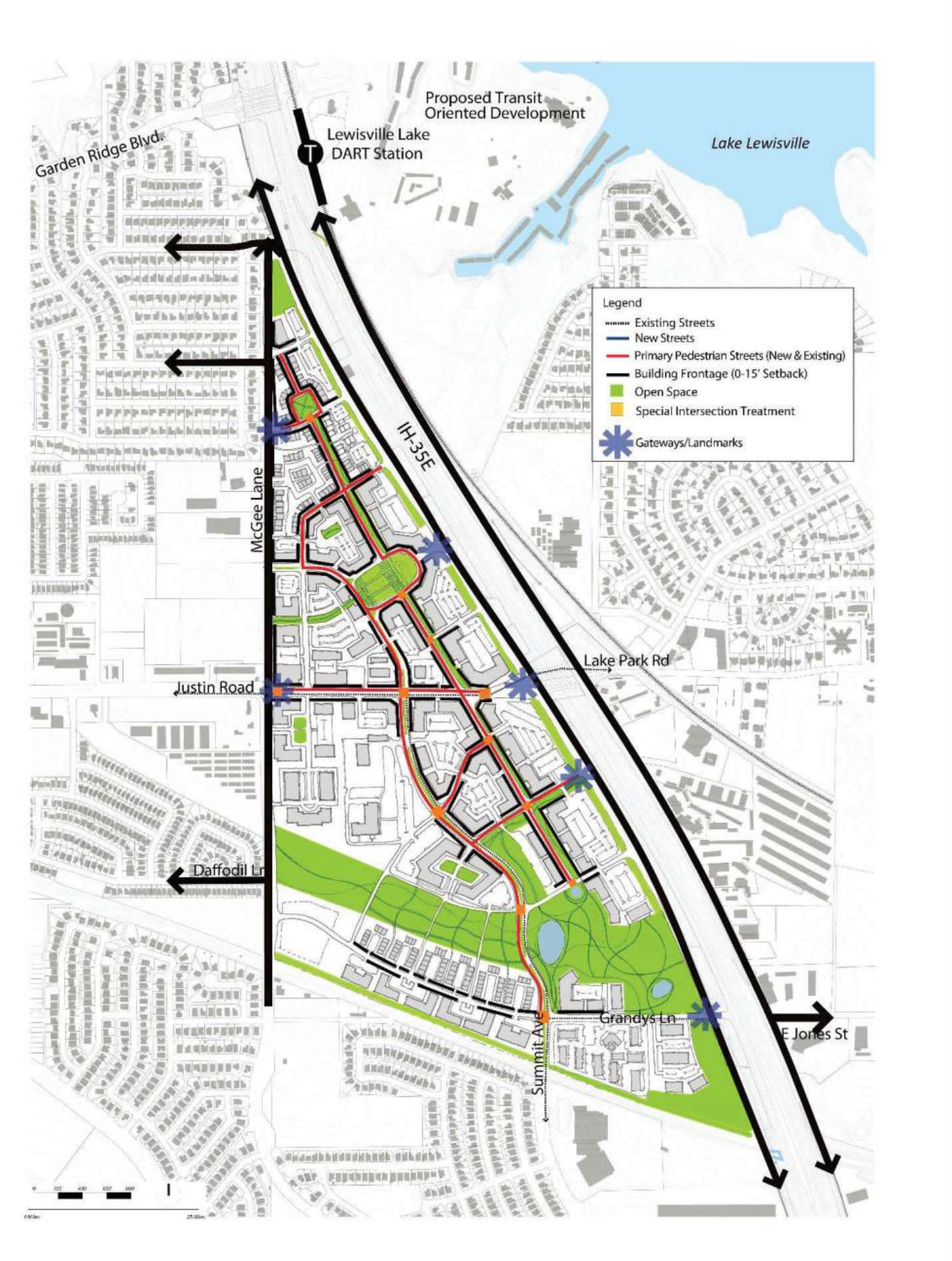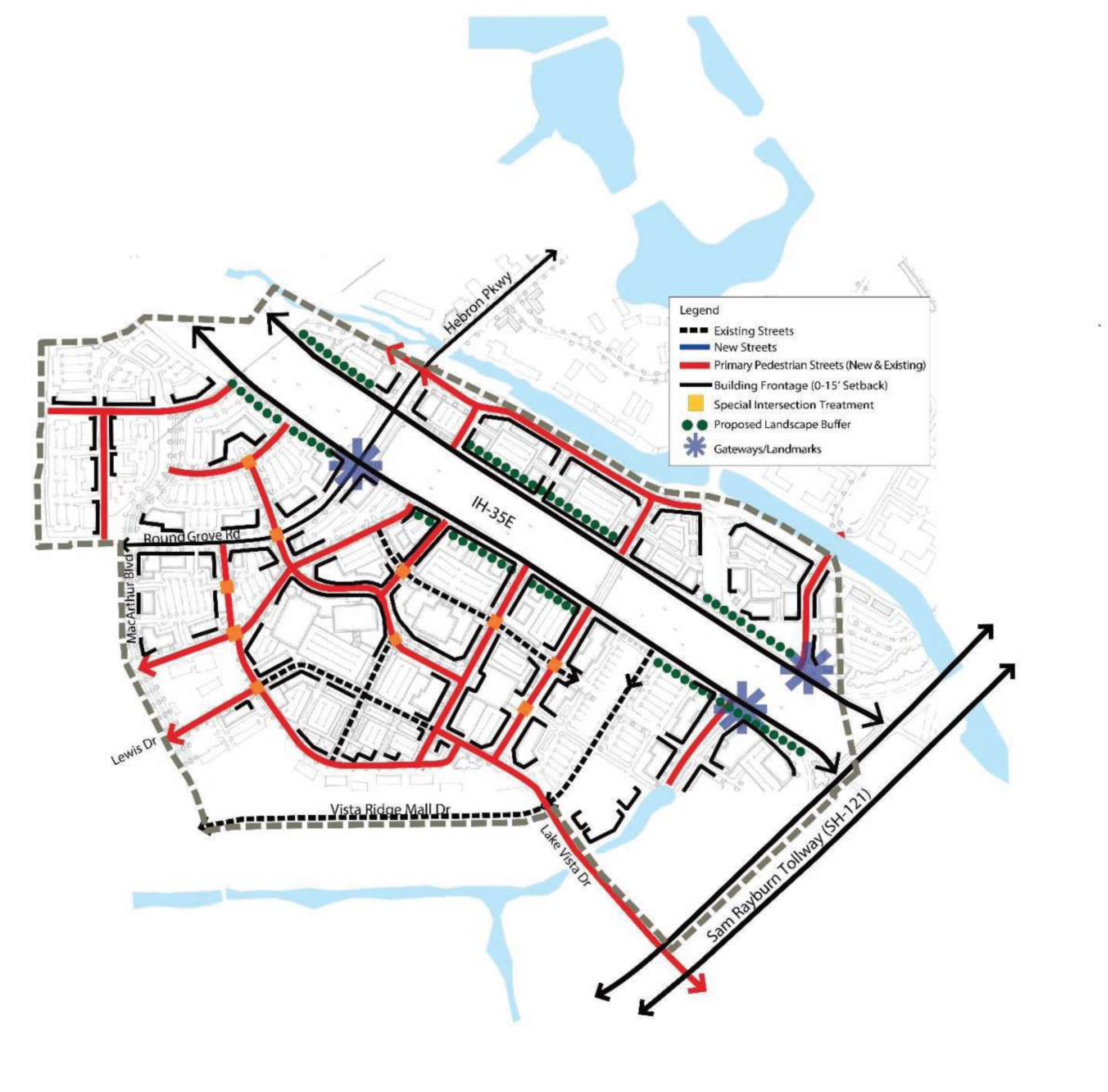 Gateways and landmarks should be focused at Garden Ridge Boulevard and Valley Ridge Boulevard, both primary entrances into the Lake area. Higher density nodal development should be focused around these gateways to draw in visitors.