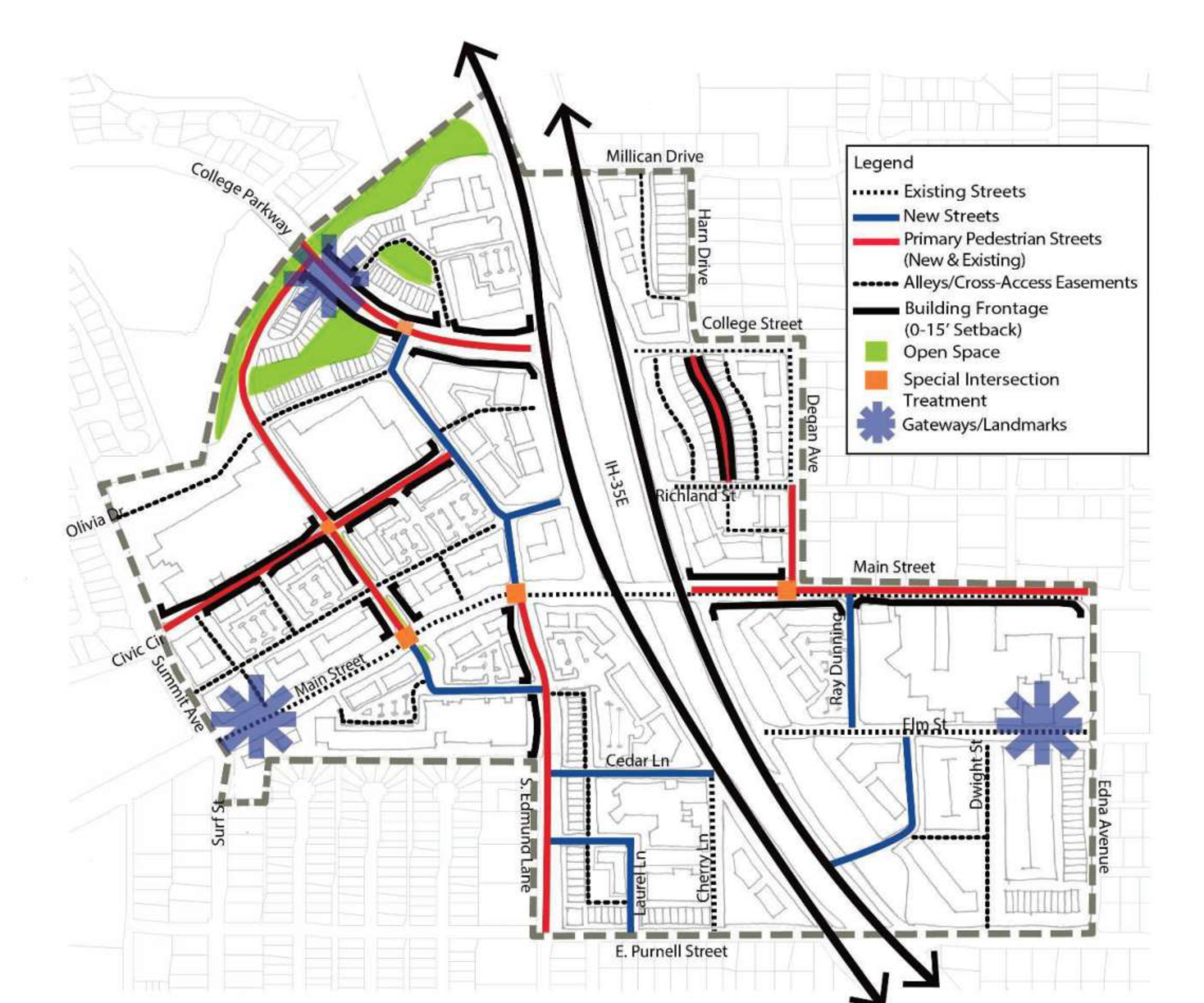 The experience and character of the corridor will be communicated through the design and treatment of its spatial elements. Following are design principles for the primary spatial elements that will be experienced throughout the corridor. Each of the spatial elements described below should be designed to complement the unifying theme and respective subarea themes along the IH-35E corridor.