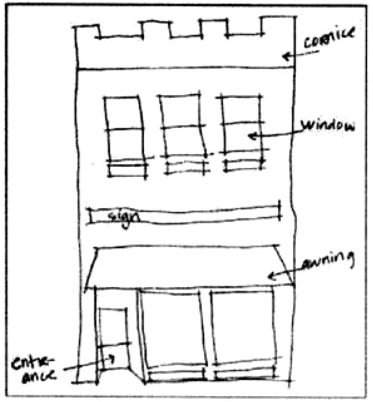 A sign typically serves two functions: to attract attention and to convey information, essentially identifying the business or services offered within a building. Architectural elements of a building, window displays, outdoor seating, and other streetscape elements can also work to supplement signage. For example, the building front alone can serve an attention-getting function, allowing the sign to be focused on conveying information.
