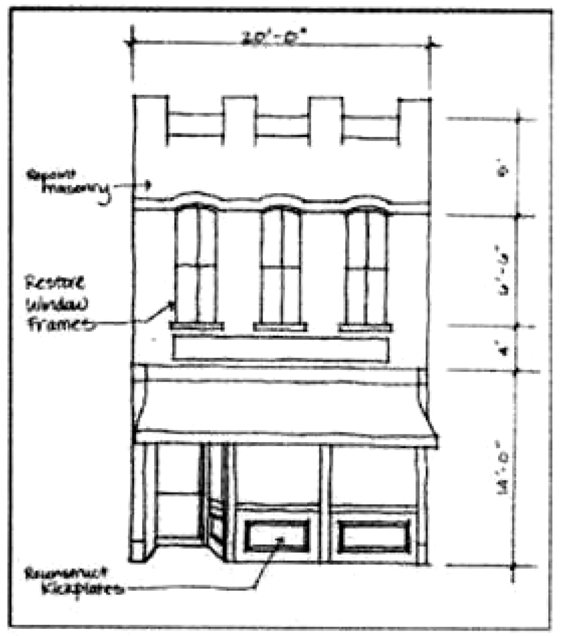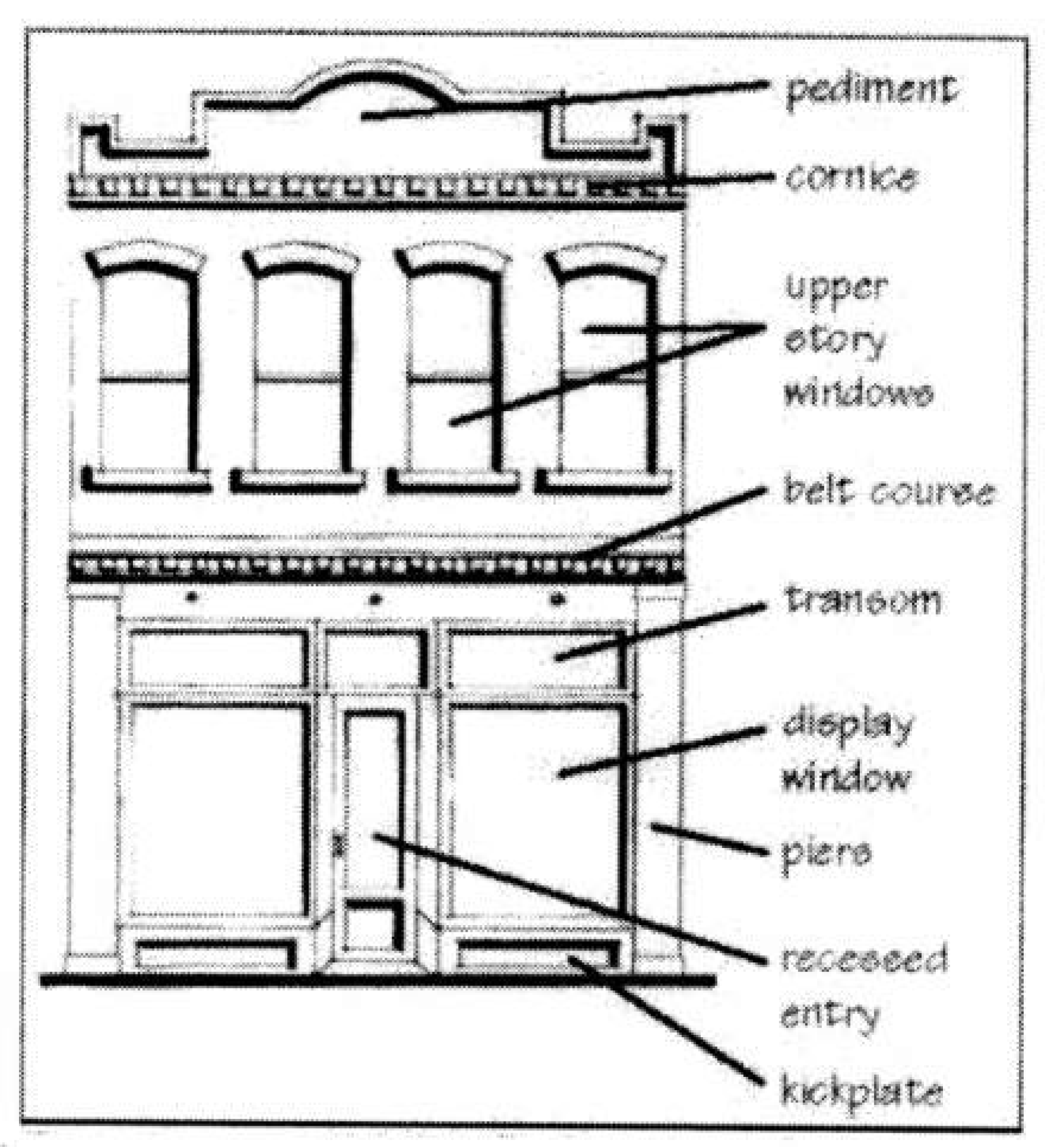 Usually between one and four stories, the vernacular commercial building is divided horizontally into two distinct bands. The first floor is more commonly transparent, so goods can be displayed, while the second story is usually reserved for residential or storage space. A steel beam that spans the glass opening typically supports the upper floor. However, many one-story examples also exist. A kick plate is found below the display window while above the display window, a smaller band of glass, a transom, is seen. Also, the main door is frequently recessed.