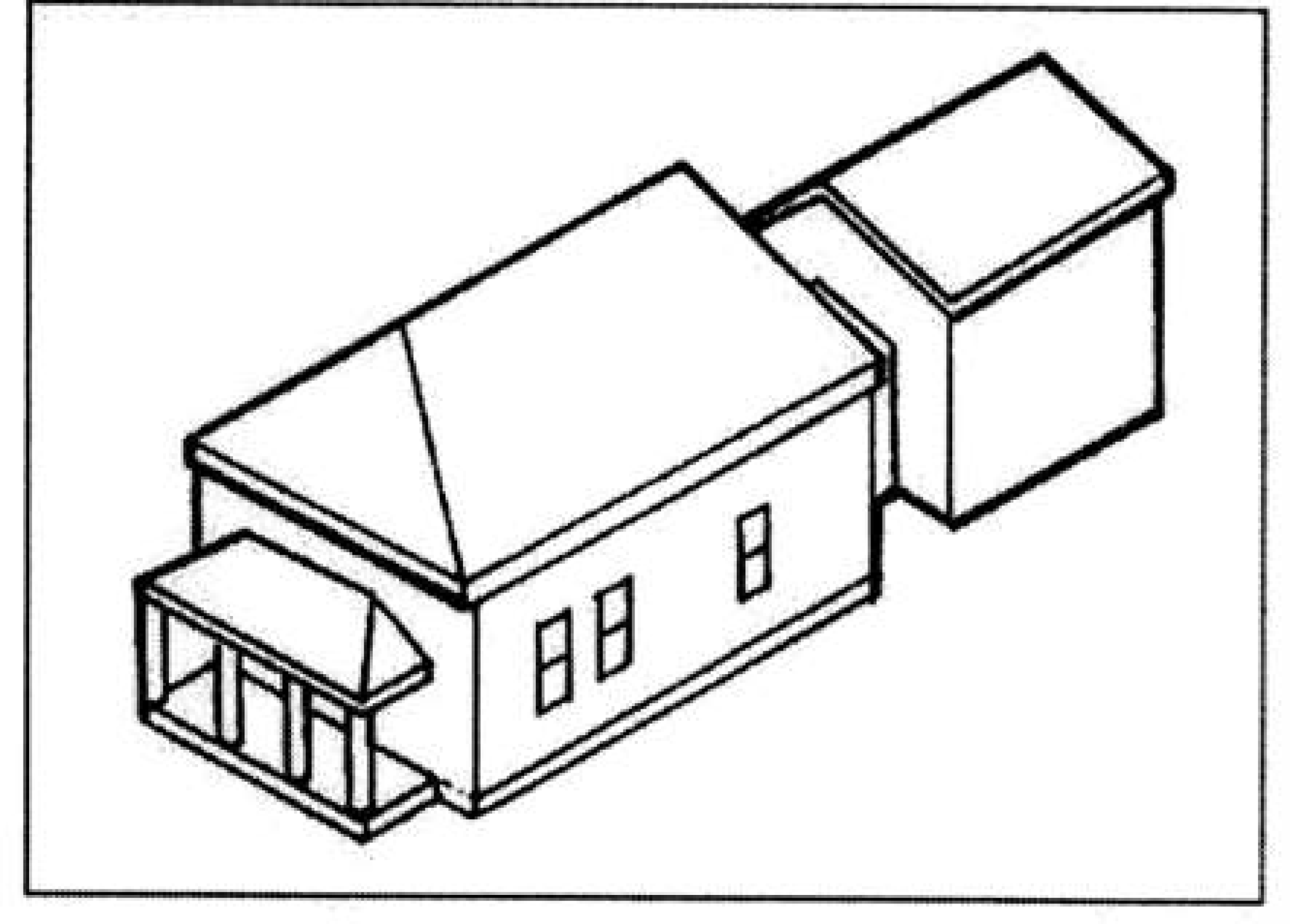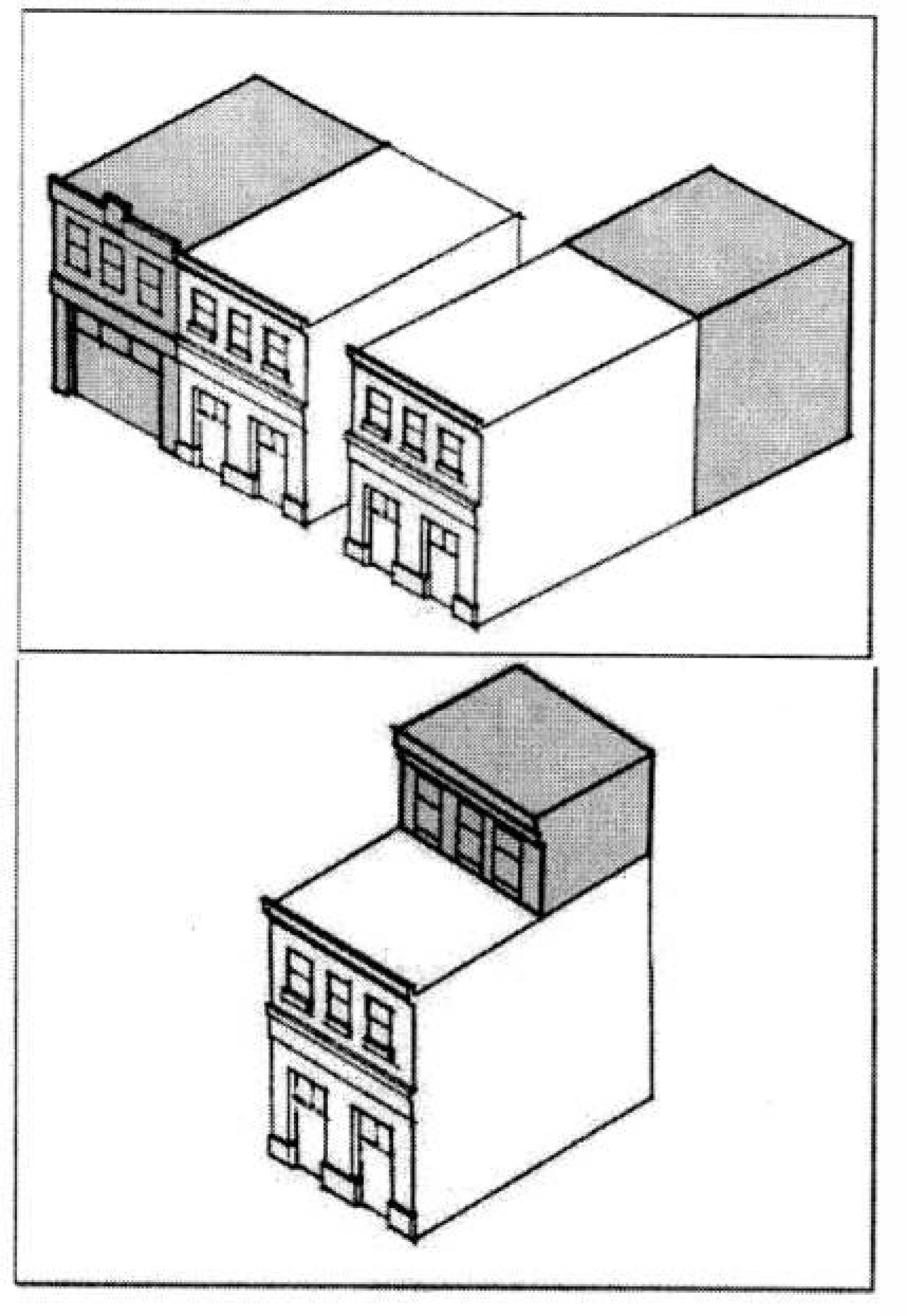 Two stores with one story wings or porches