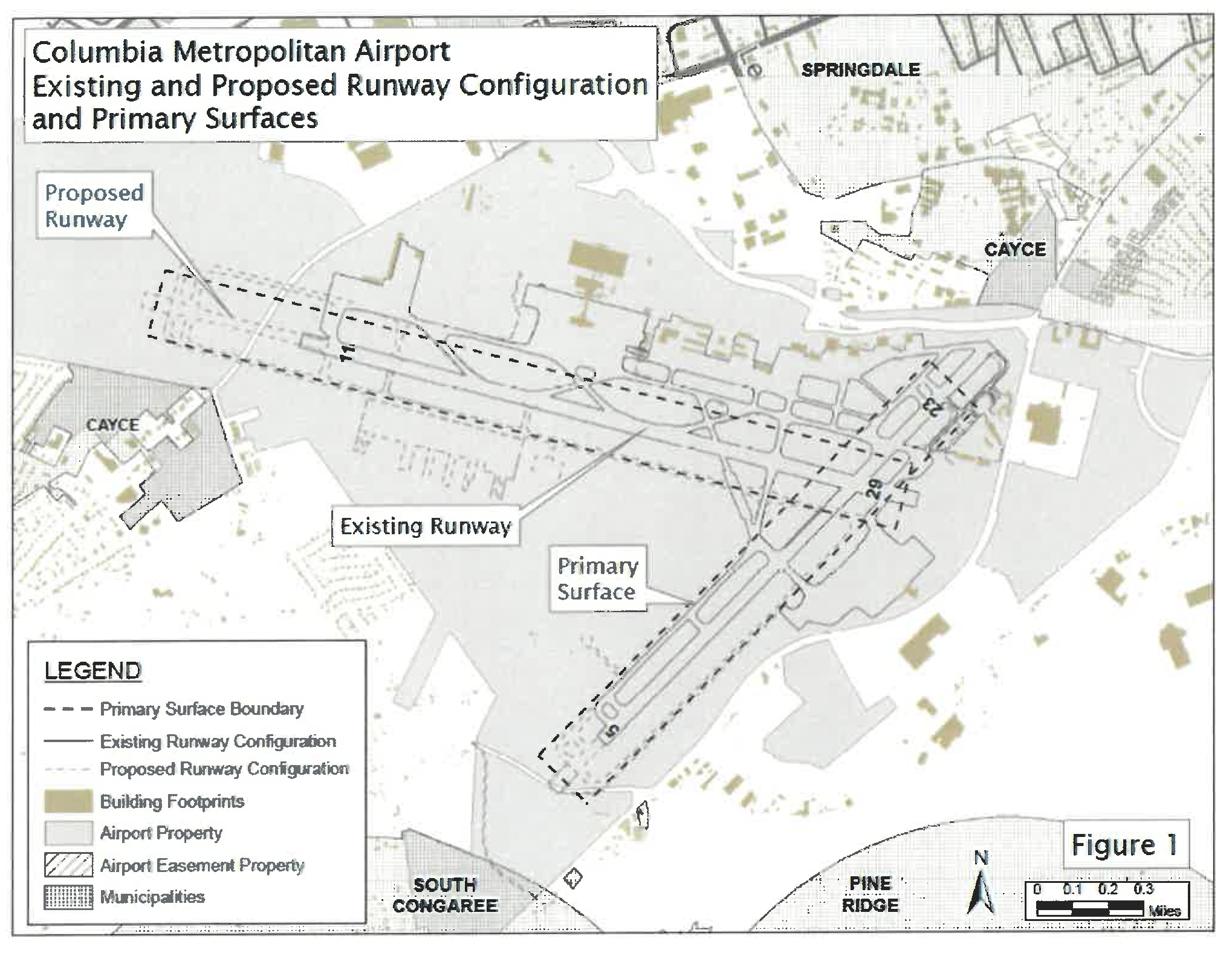 Four types of height control overlay zones are established for the Columbia Metropolitan Airport District, based on the present and proposed runway configuration described in the Columbia Metropolitan Airport Plan (see definitions) and the most current edition of Federal Aviation Administration Advisory Circular # 150/5190-4A, A Model Zoning Ordinance to Limit Height of Objects Around Airports, or in successor Federal Aviation Administration advisory circulars. Figure 1 represents the present and proposed runway configuration as well as the related primary surfaces (see definitions).