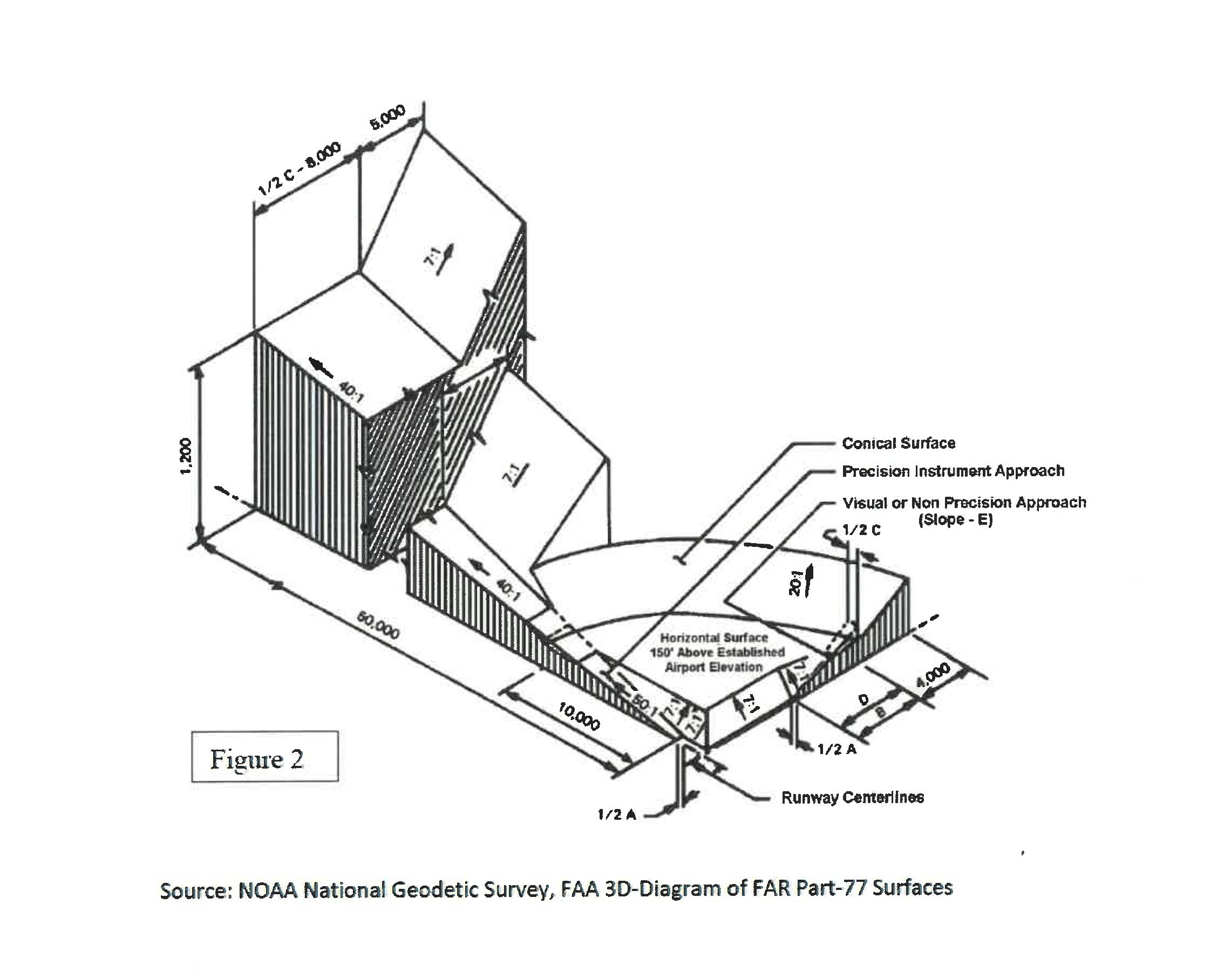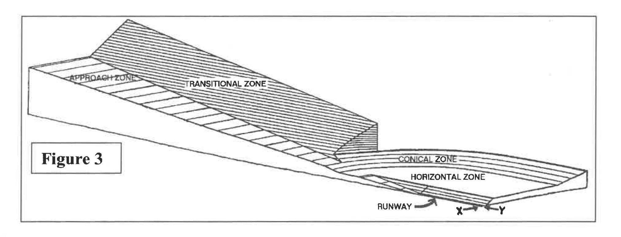 The horizontal zone (Figure 3) is established as all the area within 5,000 feet, measured horizontally, from any part of the runway surface, exclusive of the transitional and approach zones.
