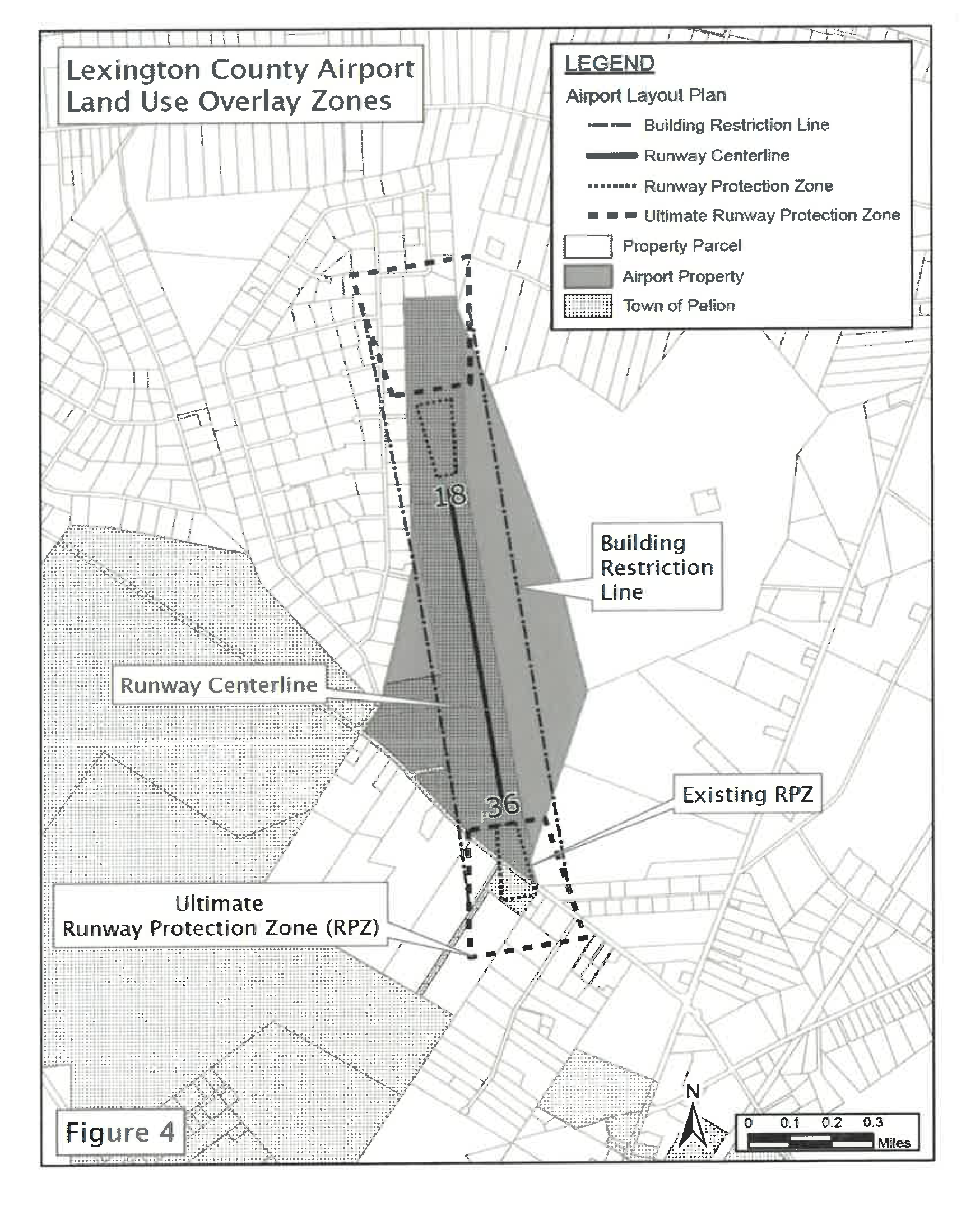 Three land use overlay zones for Runway 18 and 36, as depicted in Figure 4, are designated for the Lexington County Airport District (FAA location identifier 6J0). They are the Existing Runway Protection Zone (Existing RPZ), the Ultimate Runway Protection Zone (Ultimate RPZ), and the Building Restriction Line (BRL). No buildings, except facilities required by their function to be located near runways and taxiways, are allowed within the Building Restriction Line and the following activities are not permitted in these designated zones: