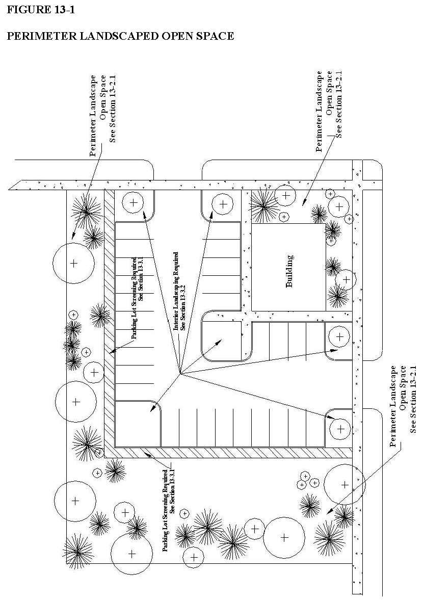 Landscaping materials. Every required perimeter landscaped open space shall consist of a combination of shade and ornamental trees, evergreen trees and shrubs (see figure 26-13-1). Areas not planted with trees or shrubs shall be maintained as a combination of groundcover and decorative paving material.