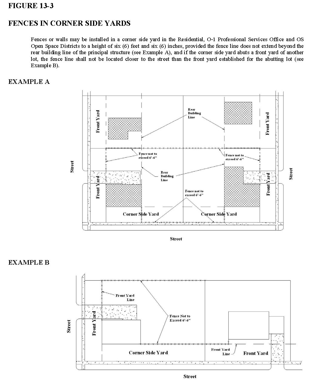 Corner side yards. Fences may be installed in a corner side yard, provided that the fence line does not extend beyond the rear building line of the principal structure and, if the corner side yard abuts a front yard of another lot, the fence line shall not be located closer to the street than the front yard established for the abutting lot (see figure 26-13-3).