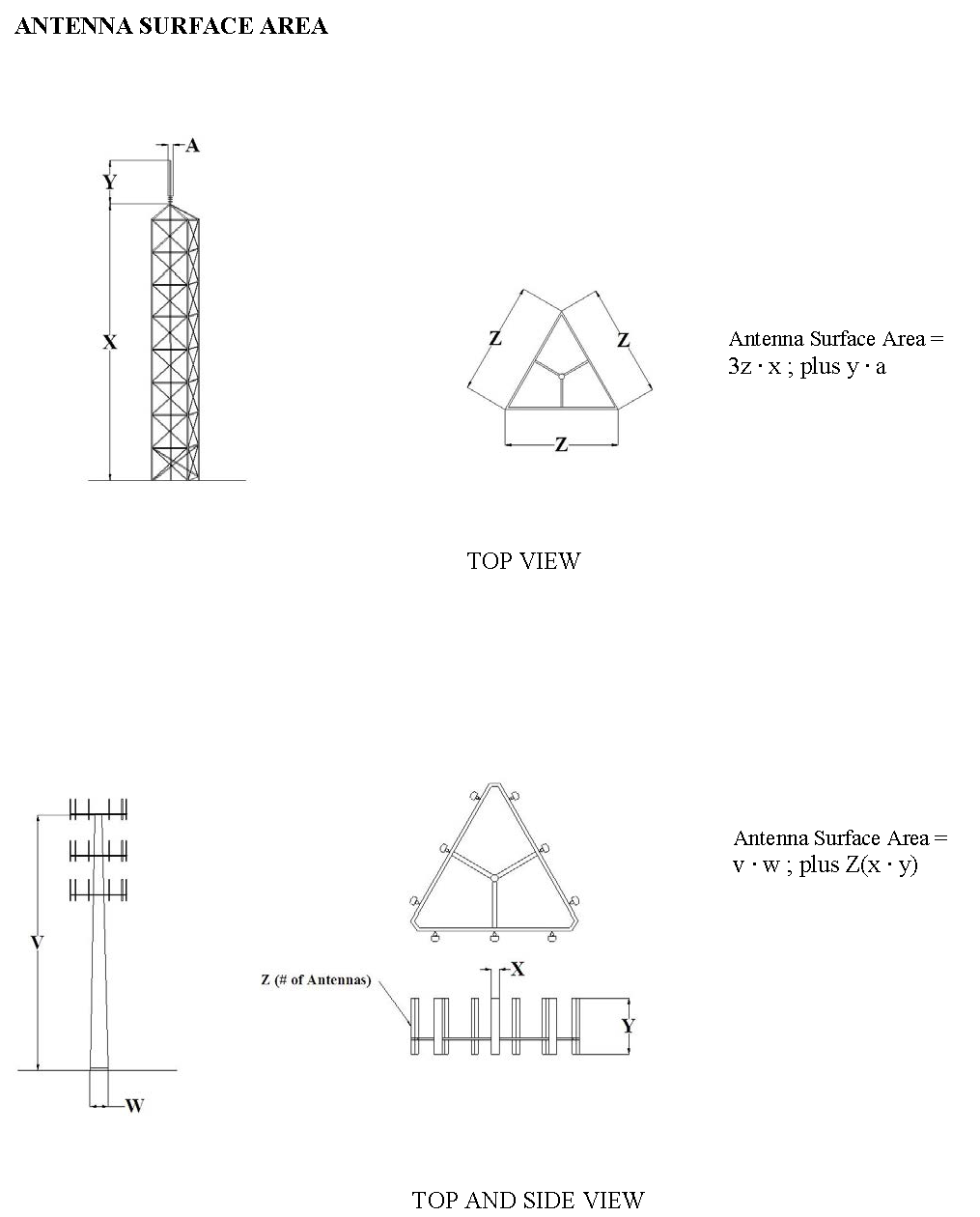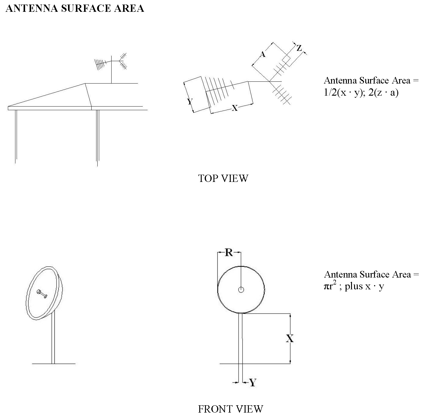 Antenna surface area. An area determined by adding together the actual surface area of each solid element or part of an antenna or its antenna support structure, where "solid" is defined to include all air spaces that are fully bounded by solid elements.