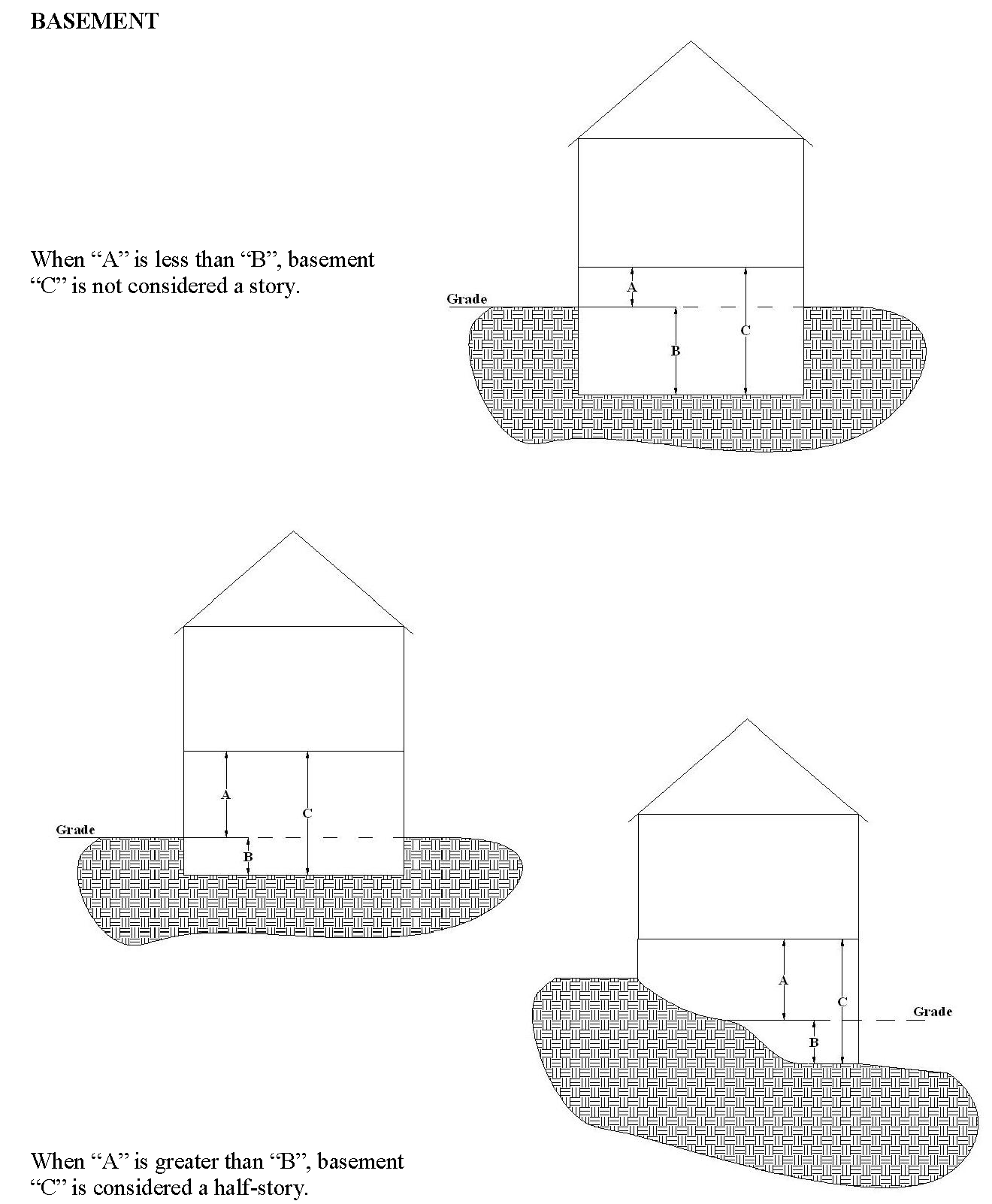A basement but only when half or more of the floor to ceiling height of a basement (over more than half of the floor area) is above grade; when more than half of the floor to ceiling height of a basement (over more than half of the floor area) is below grade, the basement shall not be counted as either a story or half story.