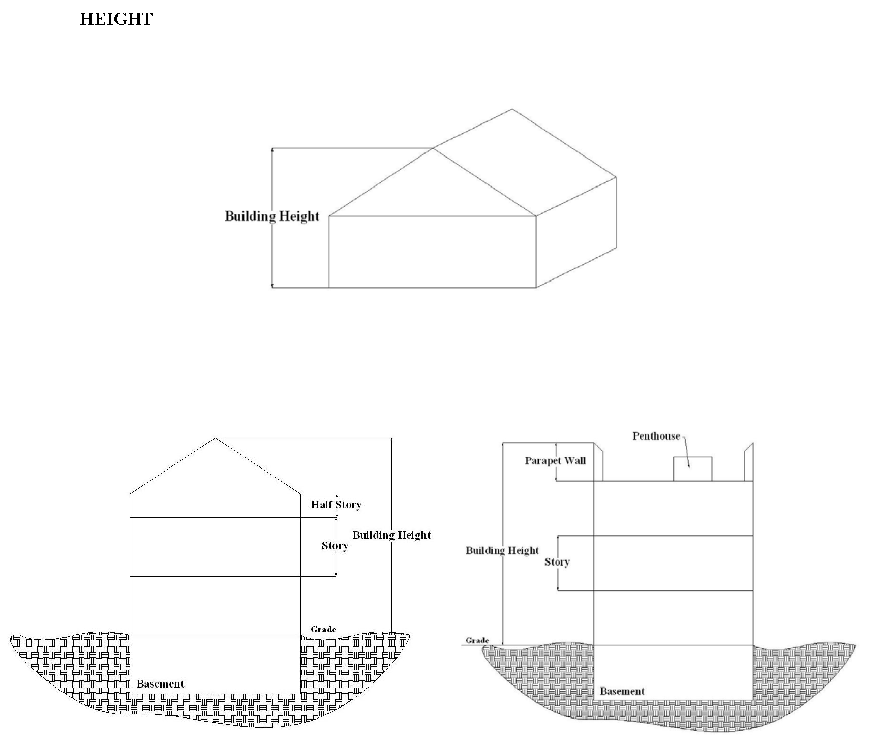 Height. The vertical distance measured from grade to the highest point of the roof. Where a parapet wall, penthouse, mechanical equipment, or any similar structure is located on the roof of a building, building height shall be measured to the highest point of said structure if any part of it extends above the height as measured pursuant to the first sentence of this definition. Chimneys of residential buildings shall be disregarded when determining the height of such buildings. (See also chapter 26, article 9 for height of accessory structures.)