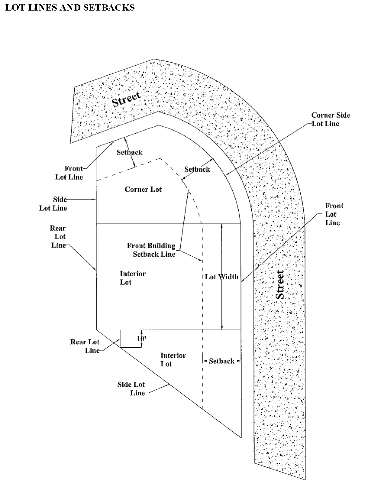 Setback. The minimum horizontal distance between a specified lot or other line, measured as nearly as possible at right angles to such lot line, and the nearest point of a building or structure.