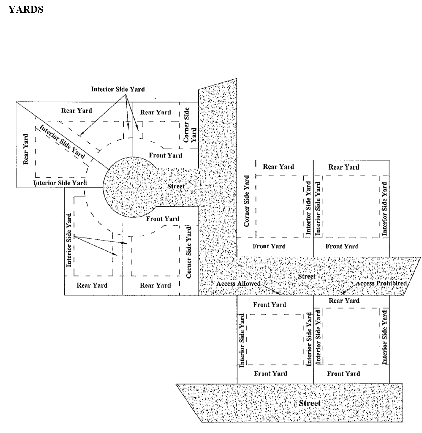 Yard, side. A yard extending between the front and rear yard lines and between the interior side lot line and the interior side yard line.