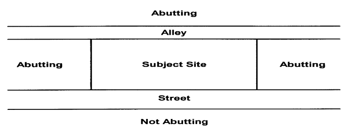 Abutting: Having property lines in common, or having property separated by only an alley. Separation by a street right-of-way is not considered abutting.