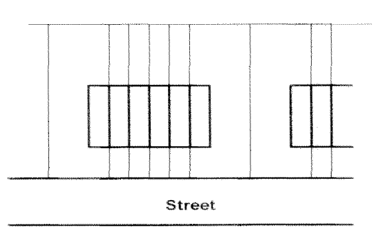 Building frontage: The width in linear feet of the front exterior wall of a particular building, as measured more or less parallel to the front property line.