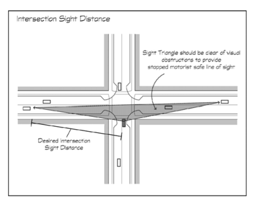 No fence, wall, sign, hedge or planting or any similar improvement will be permitted to obstruct the sight lines or visibility of motorists and/or pedestrians at any intersection of public or private streets or at any driveway intersection with a public or private street. For purposes of this section, obstructions shall be defined in terms of height as elevations between 30 inches and 12 feet above any roadway or driveway, as applicable.