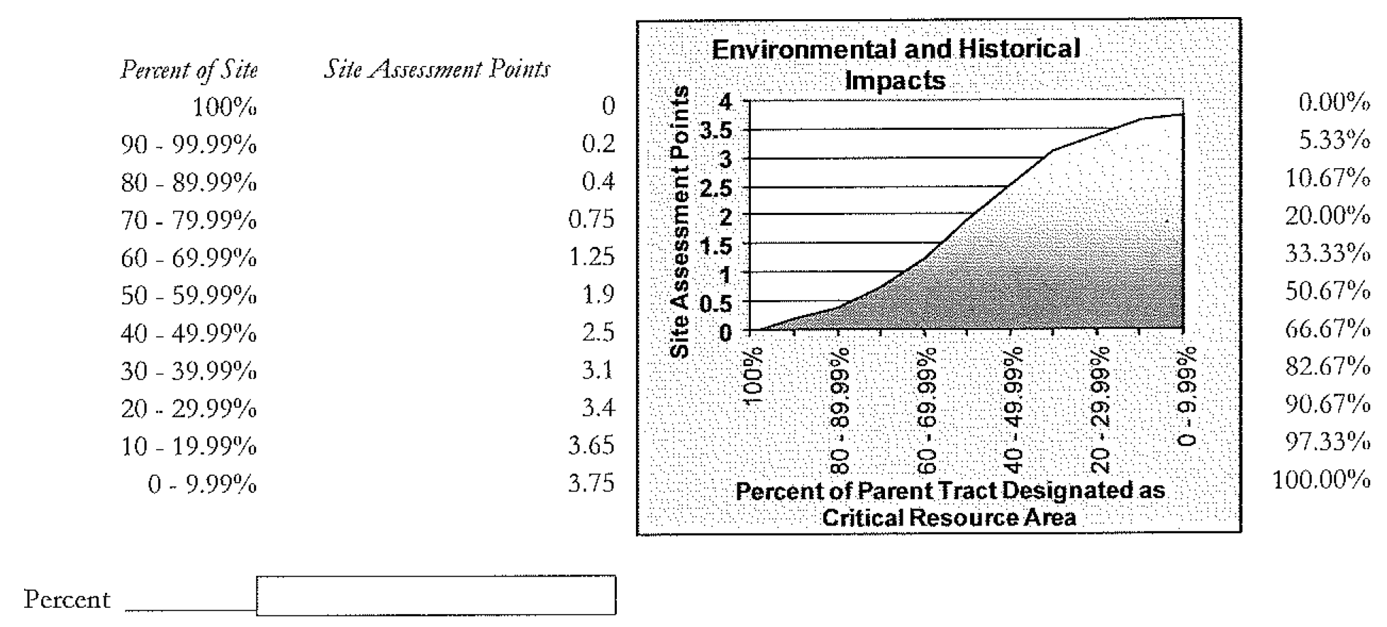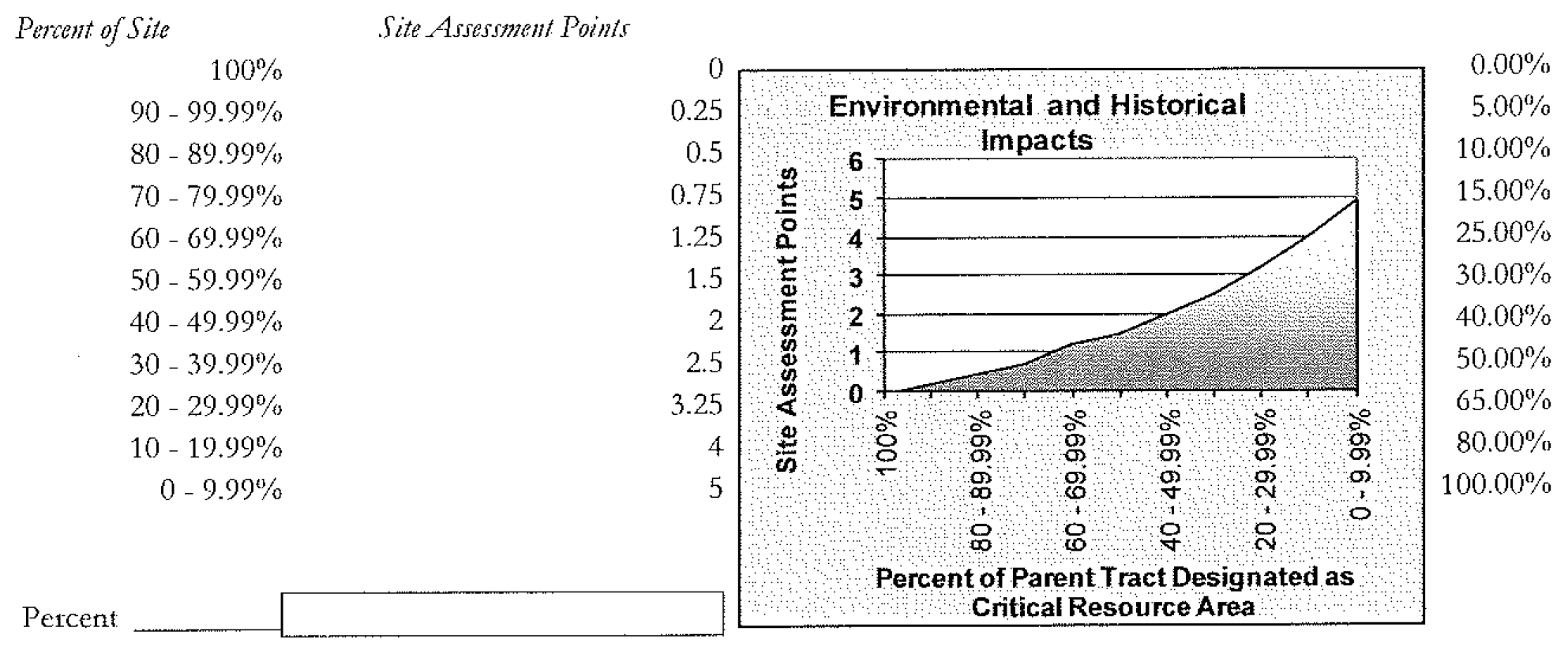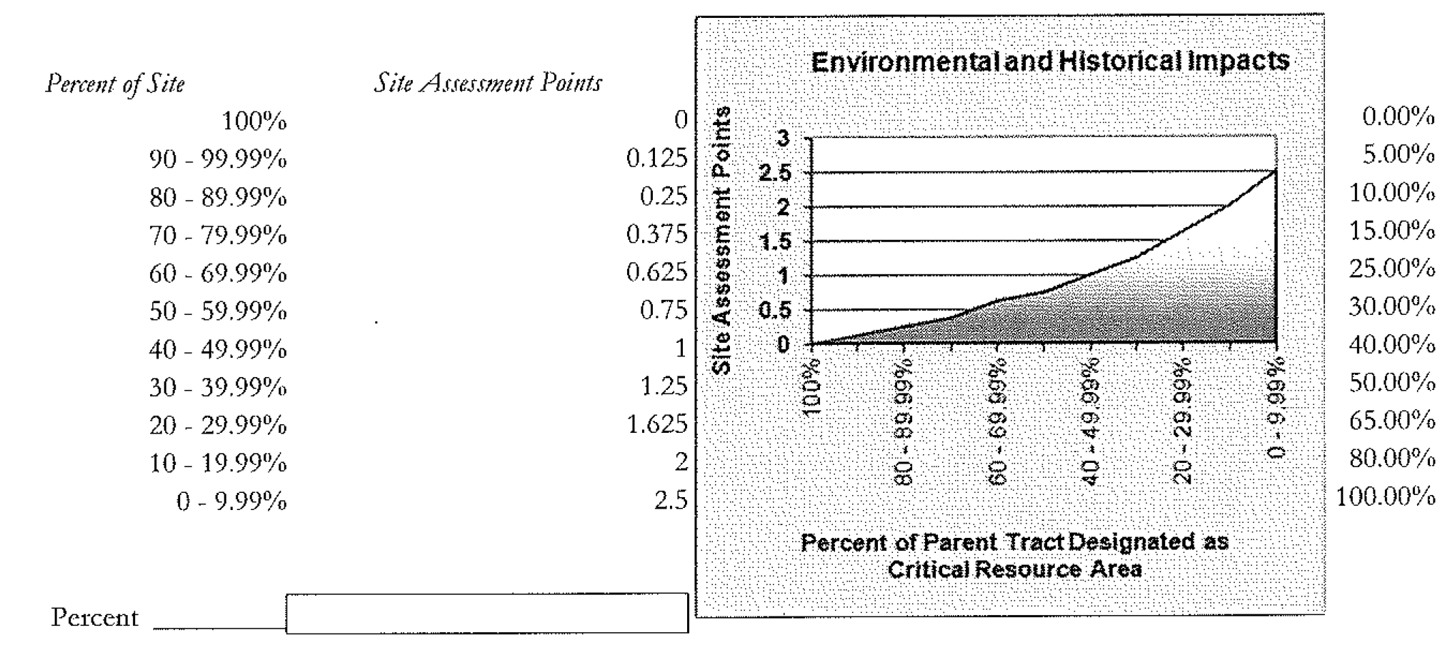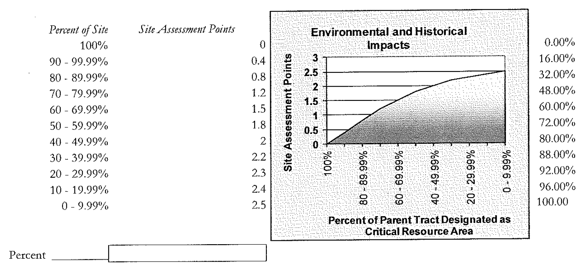 Description: This factor considers the impact of the proposed development on the environmental and historical resources of the parent tract. The percentage of the parent tract located in critical resource areas shall be identified.
