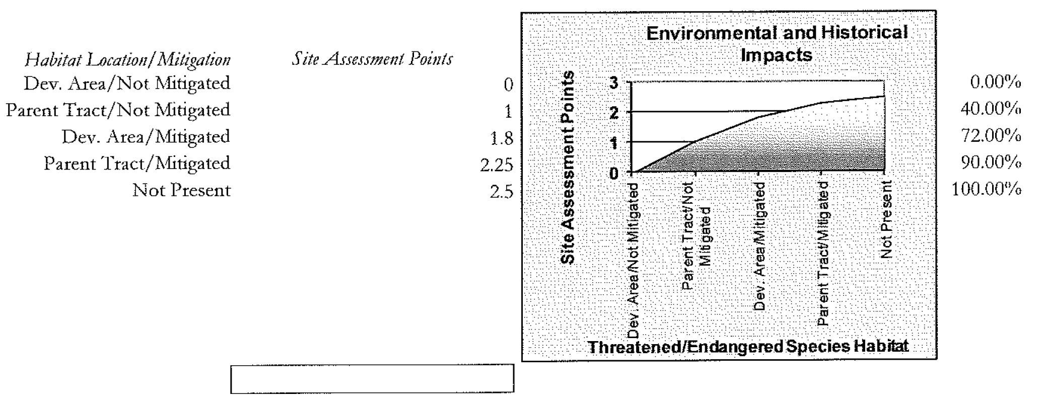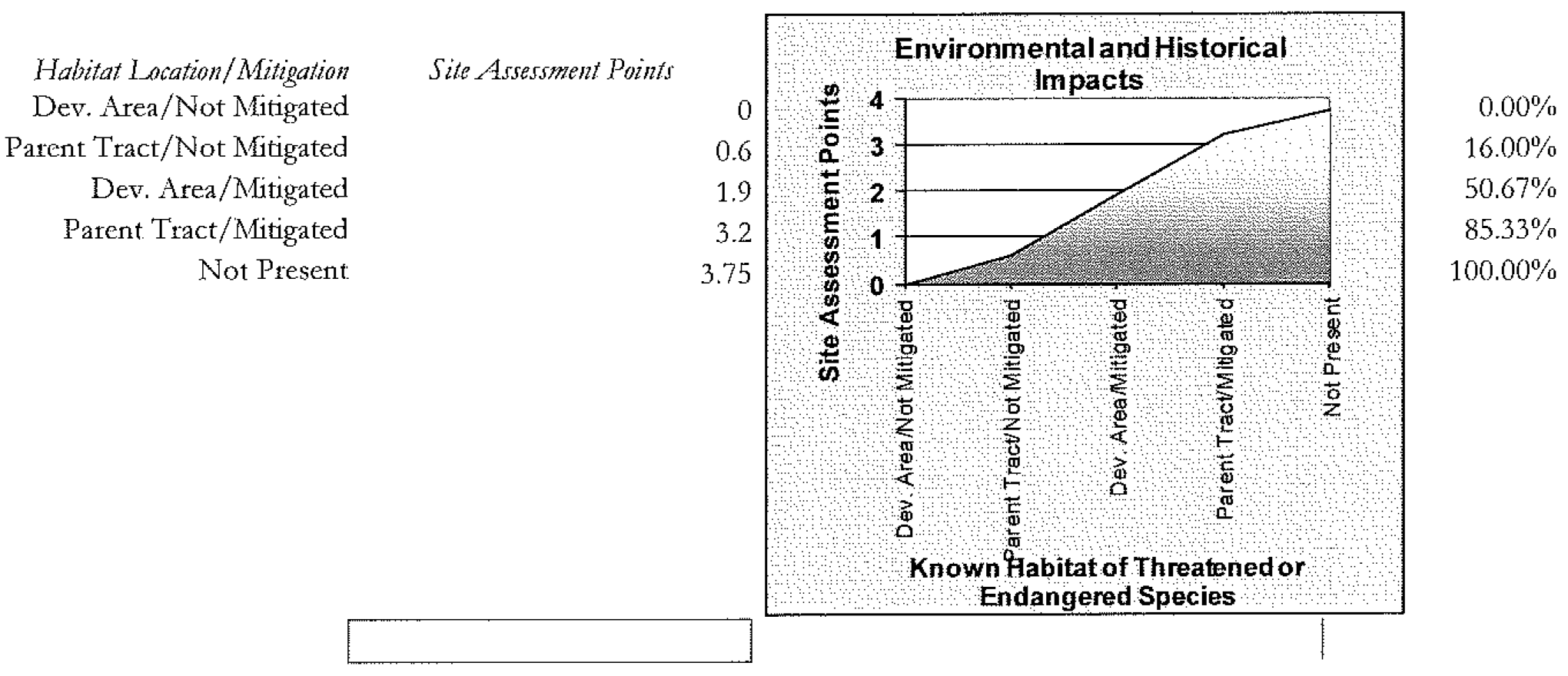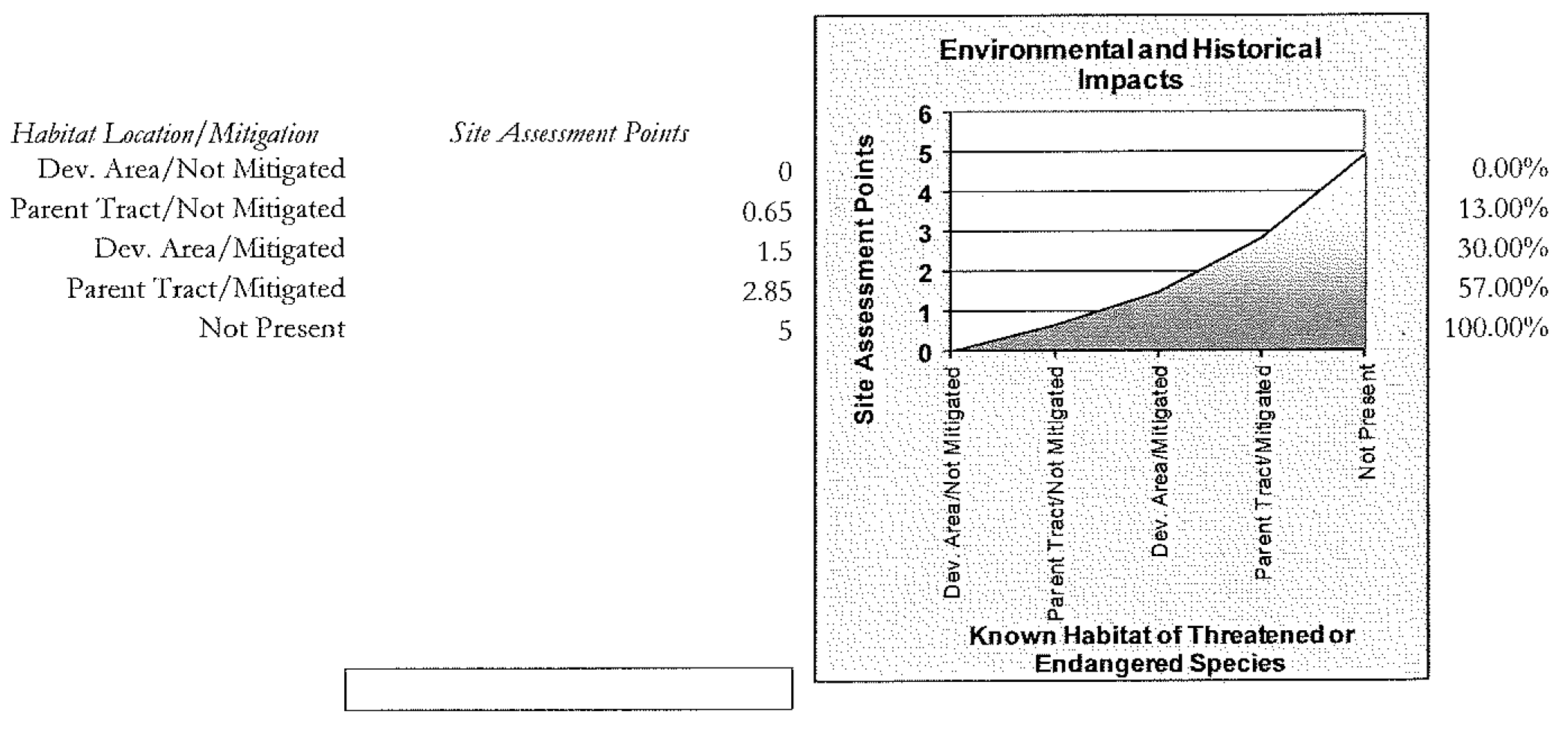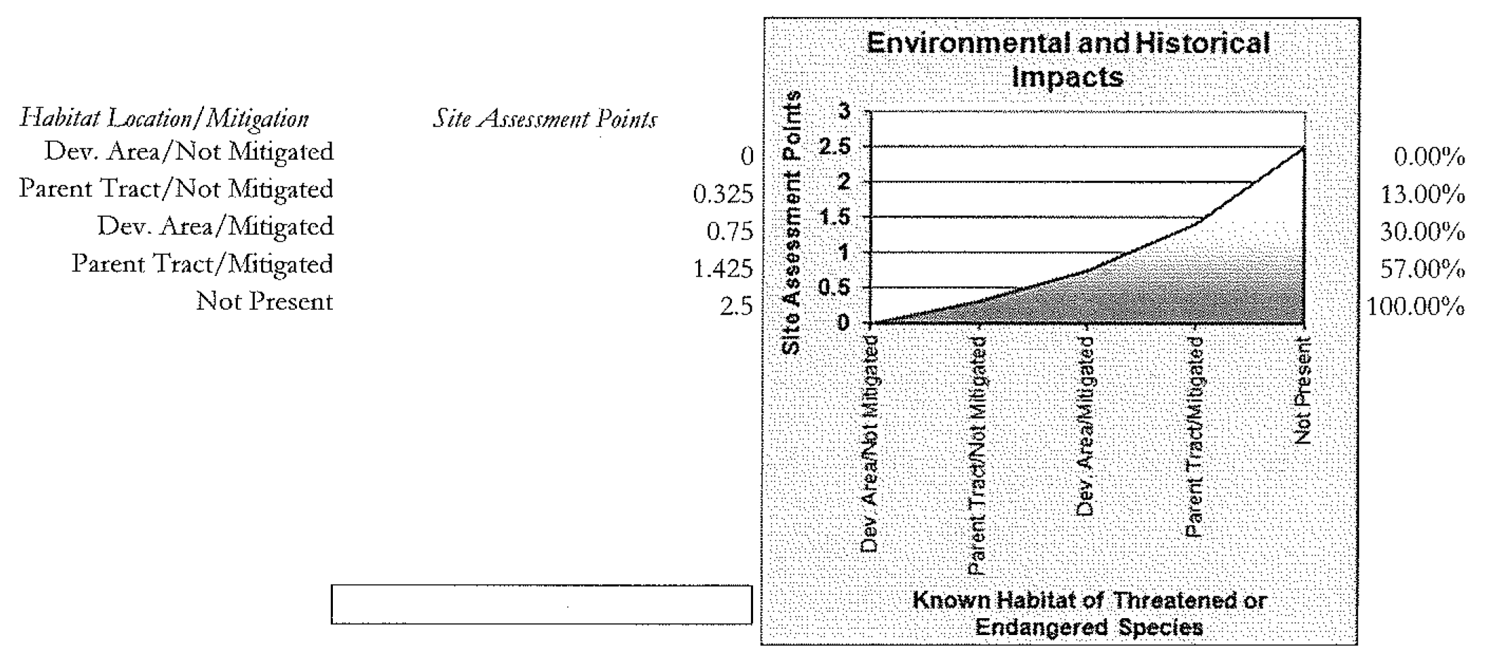 Description: This factor considers the impact of the proposed development on the environmental and historical resources of the parent tract. The known habitat of threatened or endangered species shall be identified and proposed mitigation measures considered.