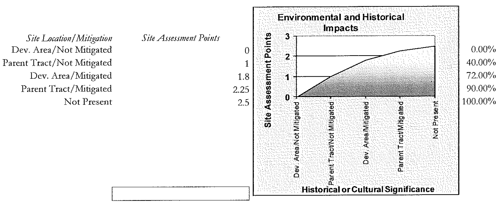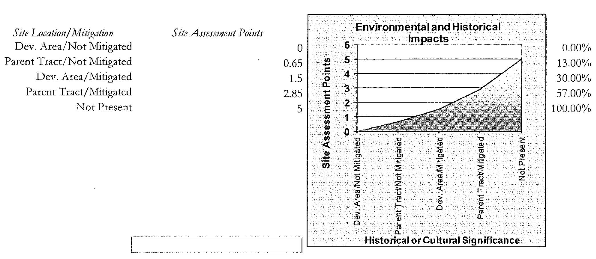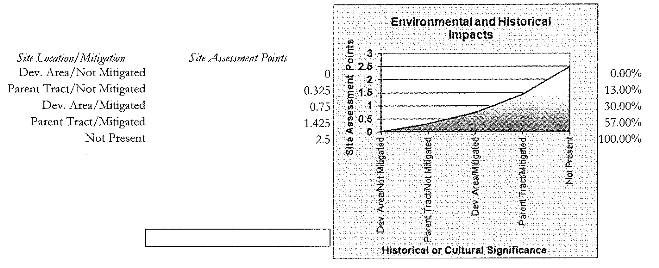 Description: This factor considers the impact of the proposed development on the environmental and historical resources of the parent tract. Inclusion in the report as a significant site shall be verified and proposed mitigation measures considered.