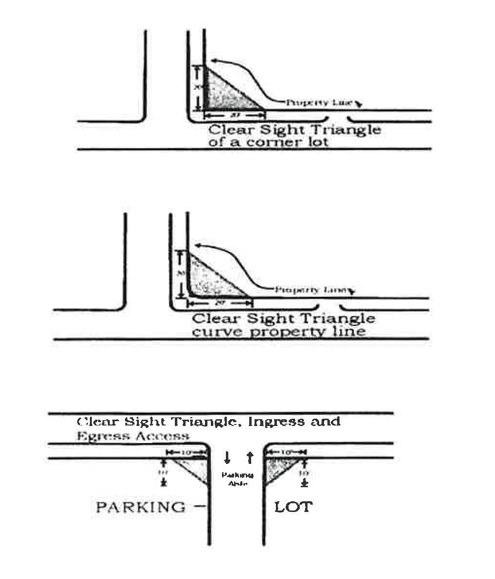 Clear sight triangle, parking lot driveway. A clear sight triangle shall be formed on both sides of a driveway into a parking lot. Size shall be determined by measuring ten feet along the property line and ten feet along the driveway. No sign more than two feet in height shall be erected or placed in this triangle.