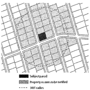 In addition to the above posted notice, notice setting forth the date, time, place and purpose of the public hearing, a general description of the proposal, and location of the subject property shall be mailed to all property owners by regular mail within three hundred (300') feet, measured radially from the lot lines of the subject property (as depicted in the figure below), as listed in the online GIS Parcel Viewer records of the Parish Assessor, at least twenty (20) calendar days before the public hearing by the Department of Planning and Development.
