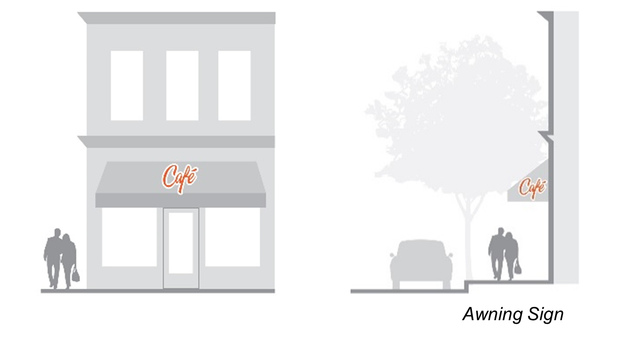 Awning Sign. A permanent Projecting Sign painted or printed on the exterior surface of an awning. Such signs may be internally illuminated pursuant to the requirements of this Ordinance. See Figure to the right.