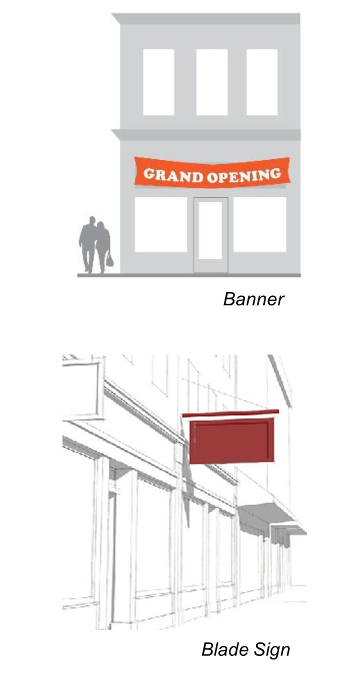 Blade Sign. A small, pedestrian-oriented sign mounted so that the sign face is perpendicular to the face of the building.