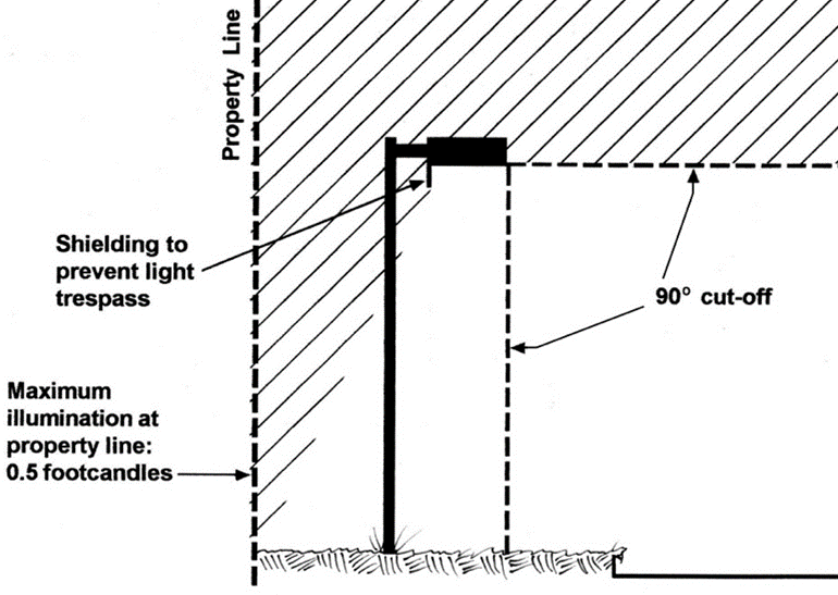 Shielding. All outdoor lighting in all use districts other than residential shall be shielded so the surface of the source of the light shall not be visible from adjacent residential districts, adjacent residences, and public right-of-way. All outdoor lighting must be directed toward and confined to the ground areas. Full cut-off fixtures must be used to prevent light from projecting above a ninety (90) degree horizontal plane (see figure).