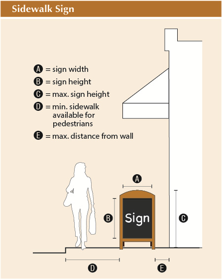 Location. Placement of a sidewalk sign must be within one (1) foot of a building wall. A minimum of four (4) feet of sidewalk width clearance shall be available for pedestrian use. Sidewalk signs must be removed each day at close of business.