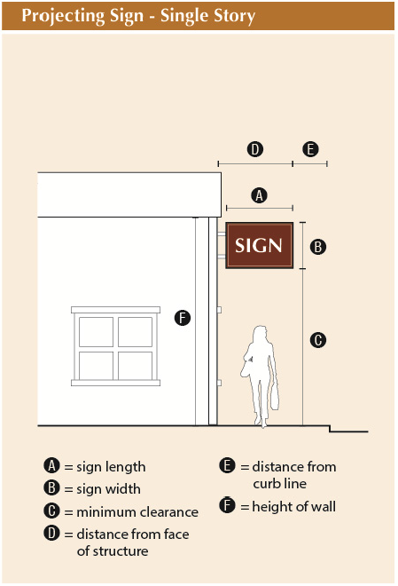 Quantity, area and height. A projecting sign shall comply with the quantity, area and height requirements established in Section 19-6-310. No structural element of a projecting sign shall be located less than nine (9) feet above finished grade. Projecting signs shall not be higher than the wall from which the sign projects if attached to a single story building, or the height of the bottom of any second story window if attached to a multi-story building. Projecting signs shall not extend more than four (4) feet from the face of a supporting building, and be no closer than two (2) feet to a curb line.