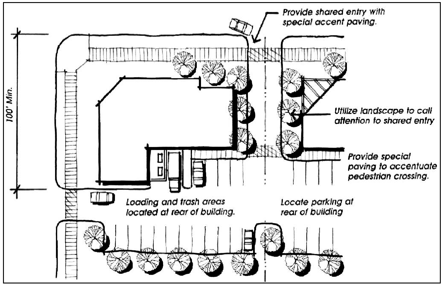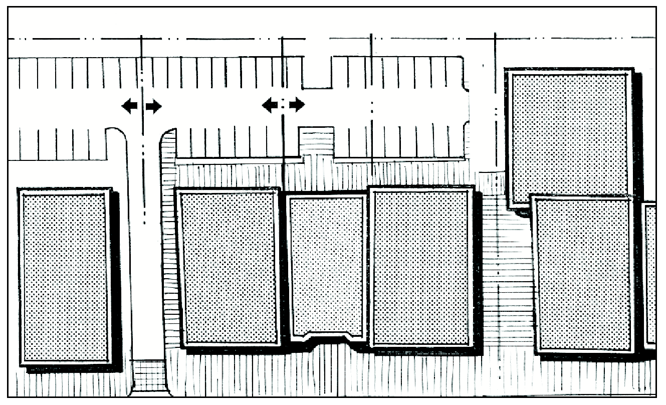 Location of Landscaping. Parking lot landscaping shall be located so that pedestrians are not required to cross landscaped areas to reach building entrances from parked cars. This should be achieved through proper orientation of the landscaped fingers and islands.