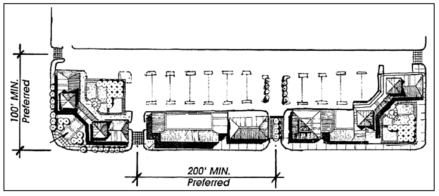 Larger Projects. Parking lots with more than one hundred fifty spaces shall provide a concentration of landscape elements at primary entrances, including specimen trees, flowering plants, and enhanced paving.